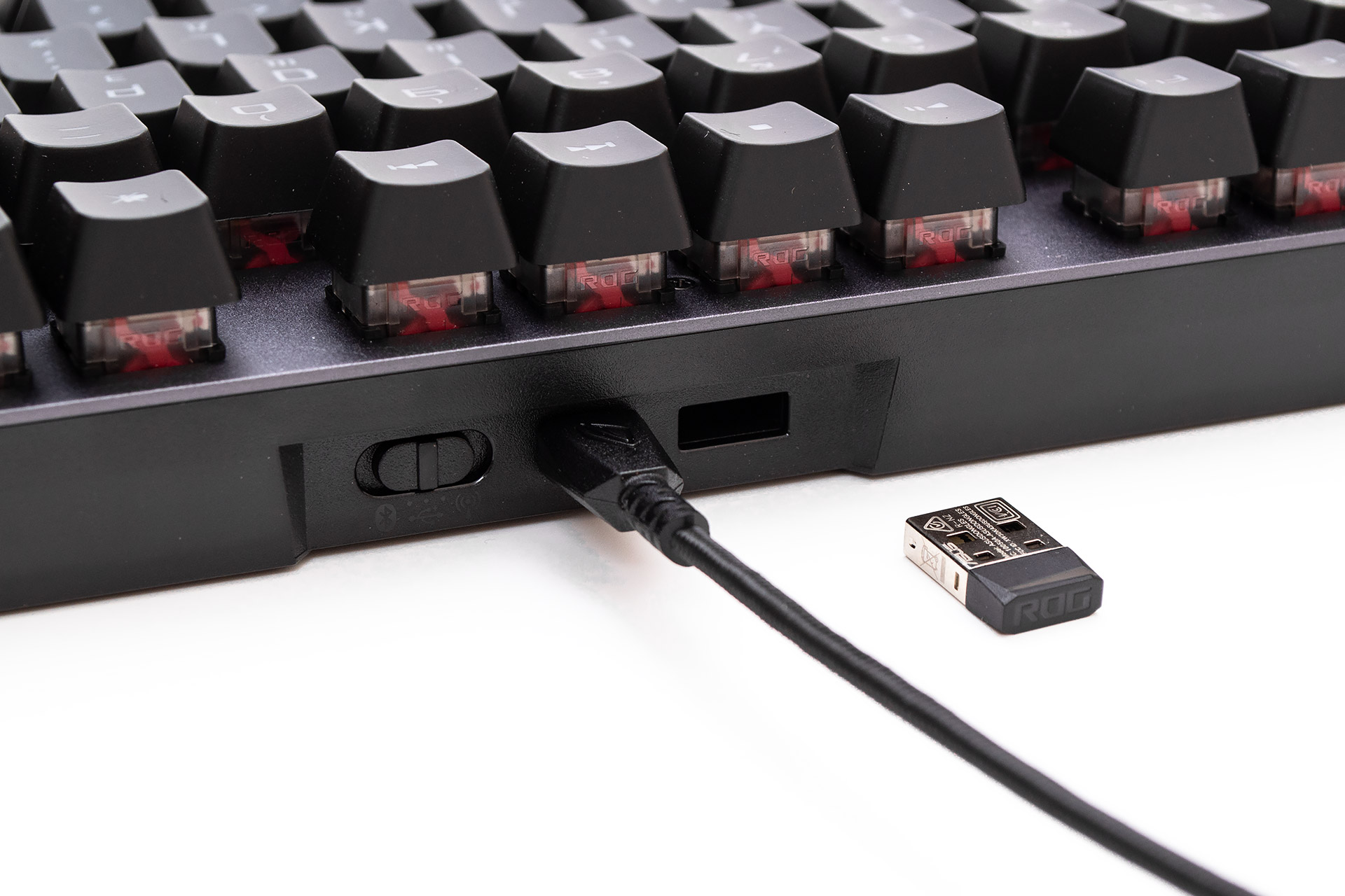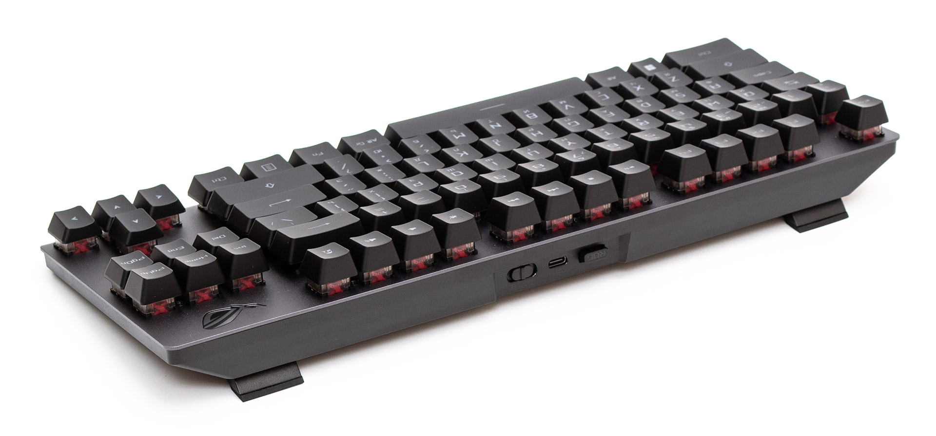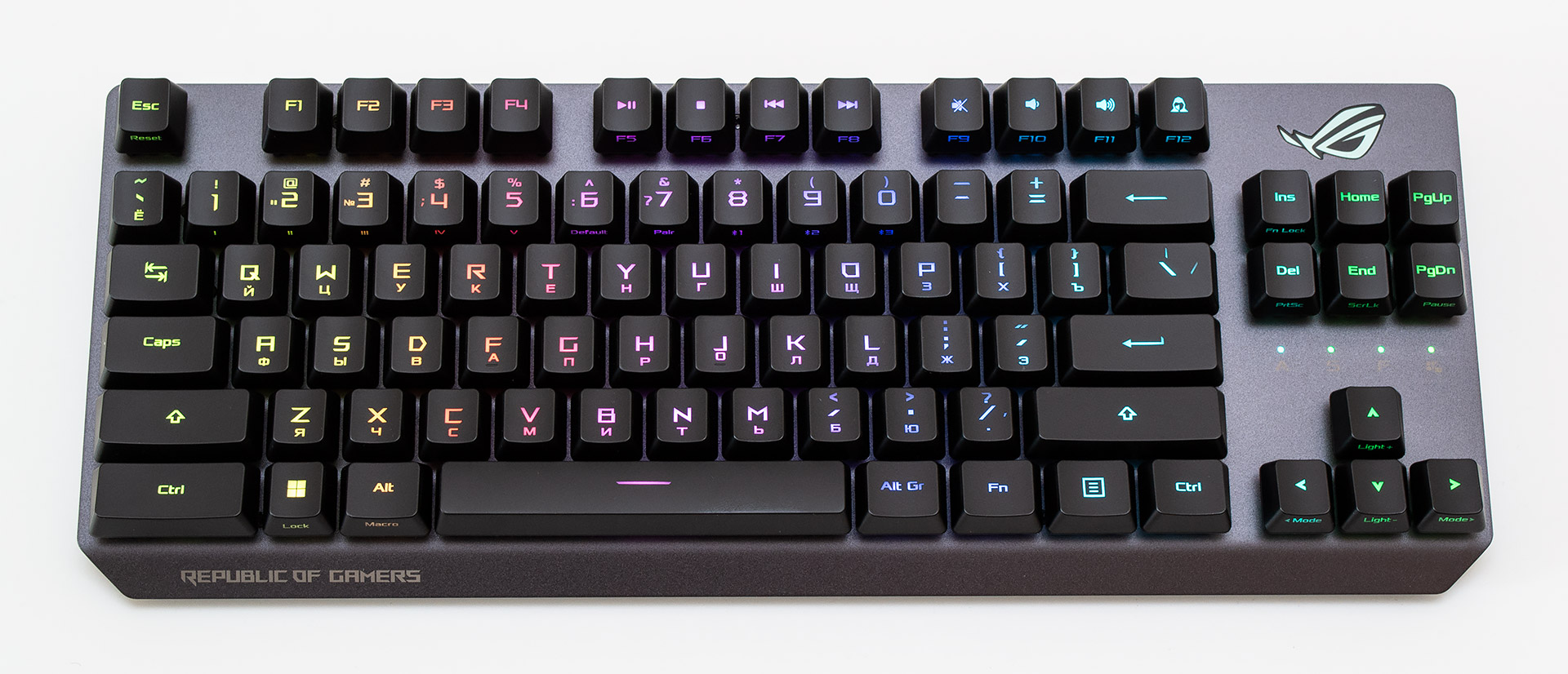 Цифрового блоку клавіш немає, оскільки це вкорочена TKL-клавіатура. Замість трьох кнопок PrtSc, ScrLk та Pause облаштовано сріблястий логотип ROG, який підсвічується та може виконувати роль індикатора заряду батареї. Над стрілочками знаходяться чотири точкові світлодіодні індикатори з позначками під ними — A (Caps Lock), S (Scroll Lock) F (Fn Lock) та символу Windows із замком (Win Lock).