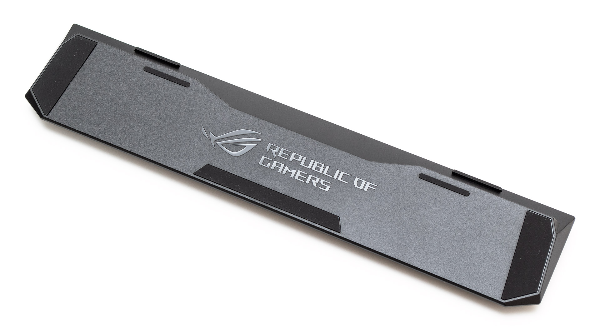 Знімна магнітна підставка під долоні має розмір 357х75х25 мм. Ззовні вона вкрита штучною шкірою, з тисненим логотипом ROG з правої сторони. Тилова її частина виконана з пластику. Тут є три великі гумові ніжки по боках та посередині, дві додаткові смужку позаду, та ще по дві прокладки у місці прилягання до клавіатури. Три великі магніти заховані посередині та ближче до країв задньої грані. Також знизу є ще один логотип та назва ROG. Вага підставки складає 163 г.