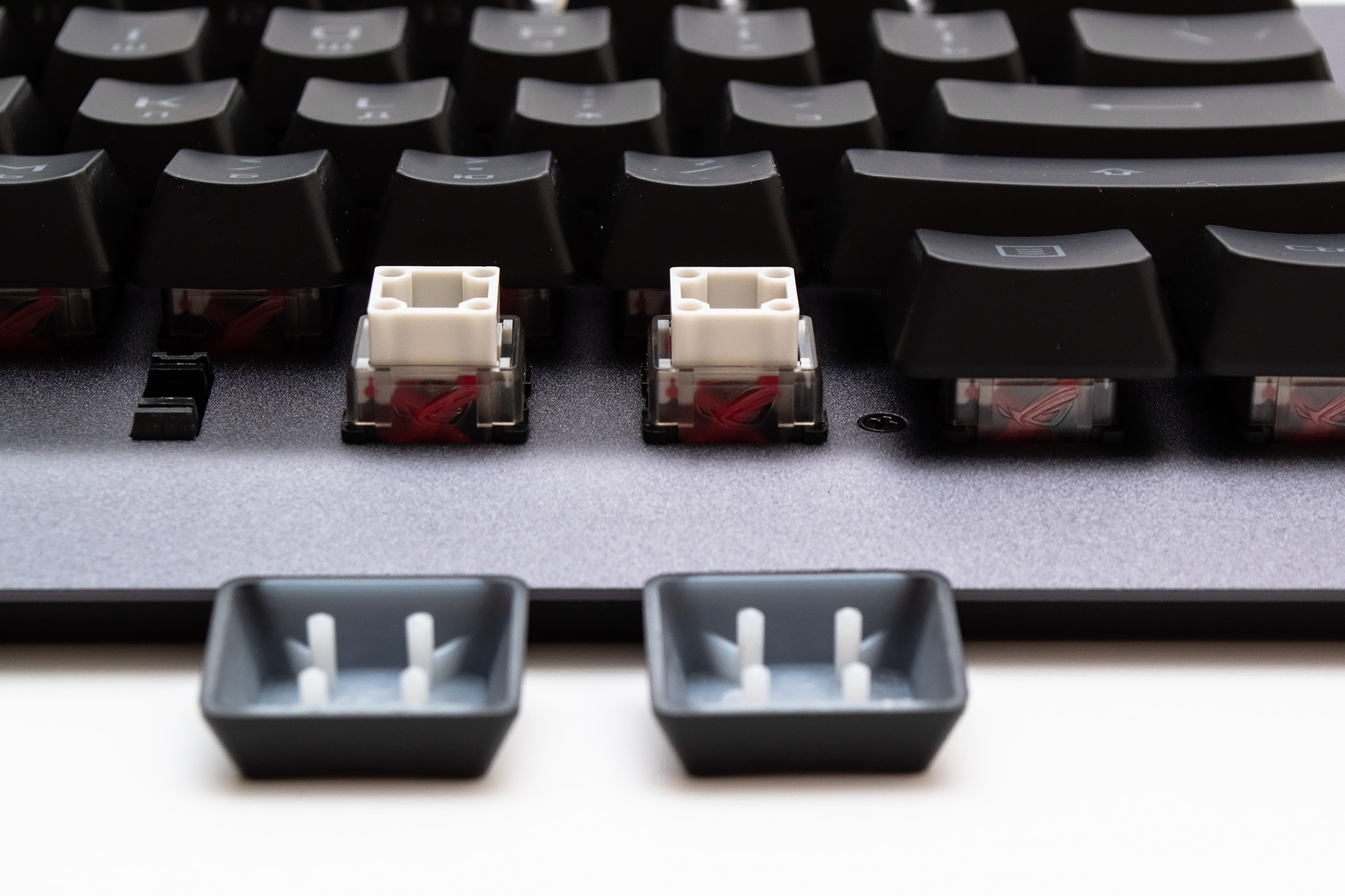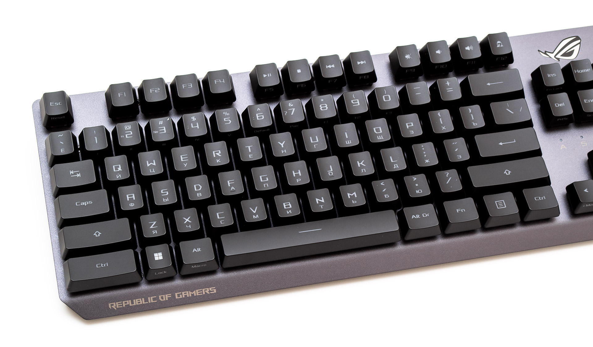 ROG RX Red є лінійними перемикачами, які мають усього 1,5 мм ходу до спрацьовування, при 4 мм загального ходу до упору. Для їх активації потрібно докласти 45 грамів зусилля, при початковому навантаженні в 40 г та піковому в 55 г. Натискаються перемикачі з м'яким спротивом і у цьому вони ближче до мембранних клавіатур, ніж до звичайних механізмів. Проте, на відміну від них, усі кнопки мають неперевершену стабілізацію в горизонтальній площині. Звук виходить досить тихий та глухий. До ковпачків клавіш є деякі питання. Вони впевнено збирають сліди жиру та поту від пальців. І в цьому випадку це звичайний фарбований ABS-пластик. До того ж ковпачки мають специфічне кріплення на чотири точки й підібрати їм неоригінальну заміну фактично неможливо. Ковпачки PBT доступні лише у версіях клавіатури з латинською розкладкою, де немає другого ряду гравіювання.