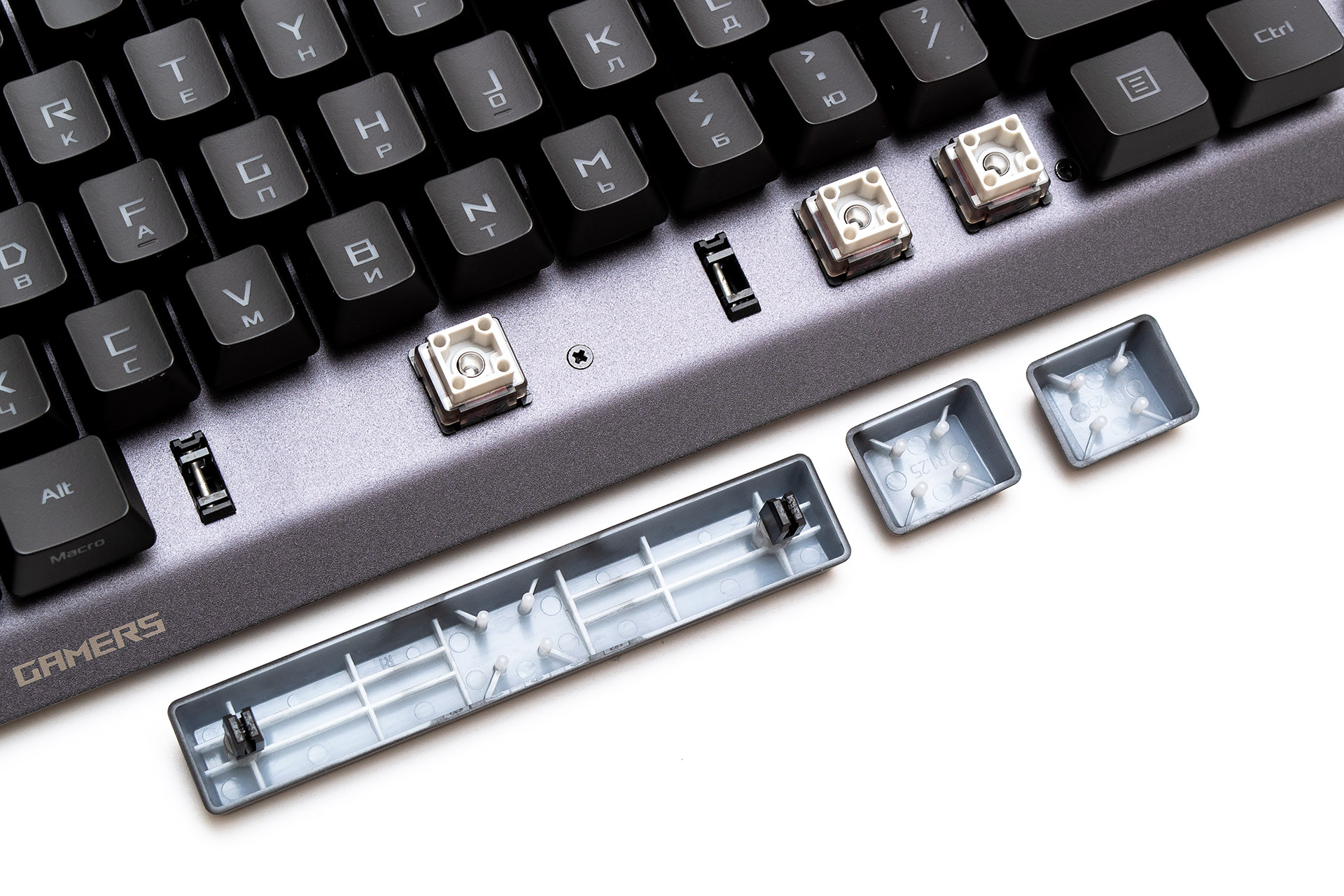 В даній клавіатурі використовуються фірмові оптично-механічні перемикачі ROG RX Red. Детально та наочно про них можна дізнатися за цим посиланням. Як усе влаштовано? Механічна частина складається зі штоку з пружиною, який при натисканні на достатню глибину перериває світлових потік між двома елементами, розташованими на друкованій платі, викликаючи миттєве спрацьовування кнопки. Переваги такого методу перед класичним замиканням контактів у механічних перемикачах самоочевидне. Нема фізичного контакту, немає потреби у затримці на «дрижання» сигналу, значно довше може пропрацювати перемикач без зайвого тертя. Швидкість реакції заявлена у межах 1 мс, хоча на практиці невідомо, яка затримка виставлена на контролері фактично. Друге елегантне рішення це Х-подібний пантограф під штоком, який, рівномірно складаючись, примушує кнопку опускатися рівно вниз, без відхилення у боки. А третя чудова інженерна знахідка — це світлодіод підсвітки на платі, по центру перемикача та лінза над ним. Це робить підсвітку рівномірною та яскравою. Стабілізатори довгих кнопок тут приховані, з кріпленням клинового типу, яке особисто мені не дуже подобається з точки зору довговічності та обслуговування.