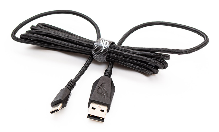 У комплекті окрім клавіатури є підставка під долоні, сигнальний кабель USB Type A на USB Type C, інструкція, брошура з інформацією по гарантійному зобов'язанню, наклейки з логотипами ROG, перехідник з USB Type C (мама) на USB Type A (мама) та мініатюрний 2,4-ГГц приймач.