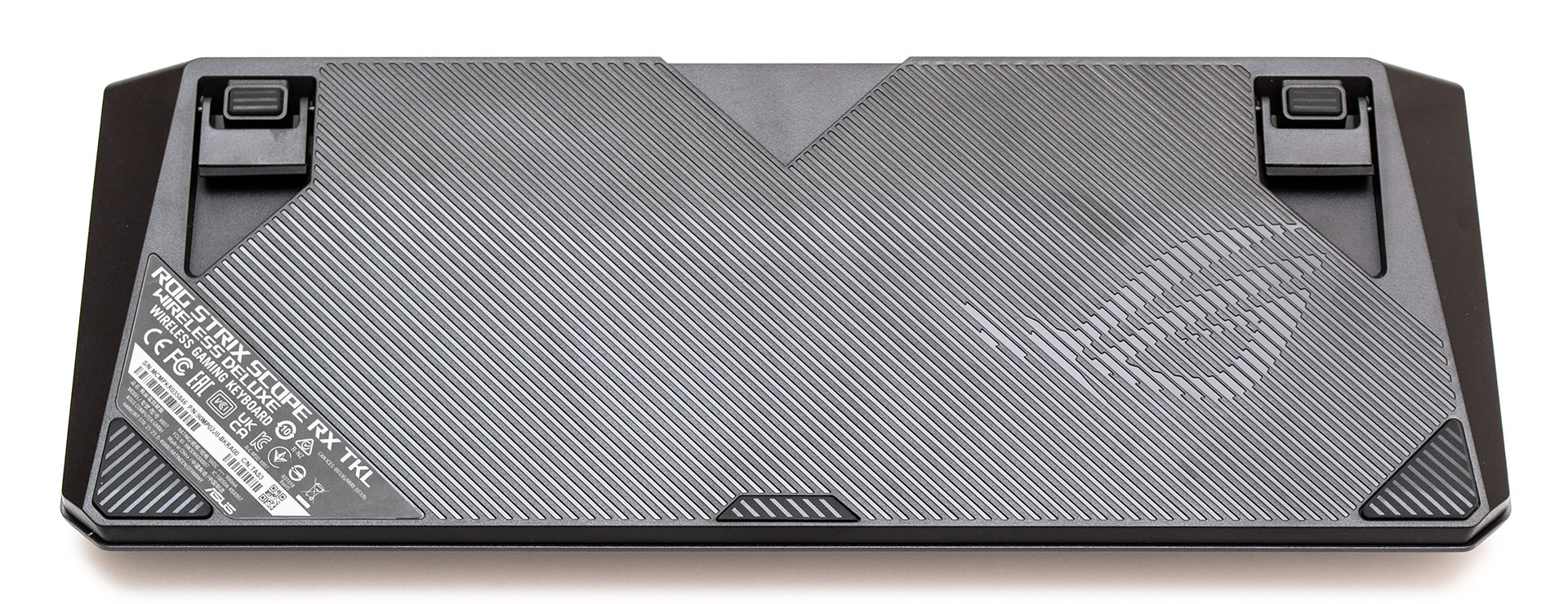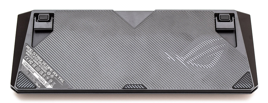 Нижня частина клавіатури пластикова, з діагональними смугами та, знову ж таки, логотипом ROG. П'ять гумових ніжок мають спеціальну «липку» фактуру. Якщо берегти їх в чистоті, то клавіатура буде триматись за глянцевий стіл як приклеєна. Наліпка з серійним номером знаходиться біля правої ніжки.