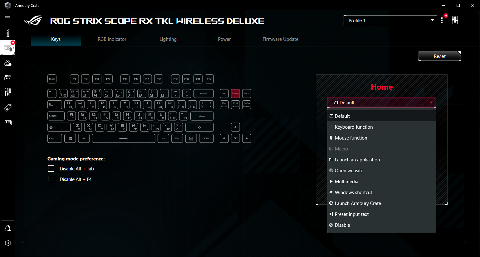 Як програмне забезпечення ASUS ROG Strix Scope RX TKL Wireless Deluxe використовує досить громіздкий застосунок Armoury Crate з великою кількістю вимогливих до ресурсу процесів та зайвих елементів. ПЗ потребує завантаження та інсталяції. Для налаштування клавіатури є чотири вкладки. Перша відповідає за зміну призначення кнопок. Для цього доступні усі клавіші окрім Fn. Призначити можна команди клавіатури та миші (лише лівої чи правої кнопки), макрокоманди, запуск програм чи відкривання сайтів, мультимедійні та Windows команди, запуск самого ПЗ Armoury Crate, введення певного тексту, повне відключення клавіші, або повернення її функції за налаштуванням. Є і кнопка скидання всього на початкові налаштування. Також в ігровому режимі окрім кнопки Win можна відключити комбінації Alt+Tab та Alt+F4.