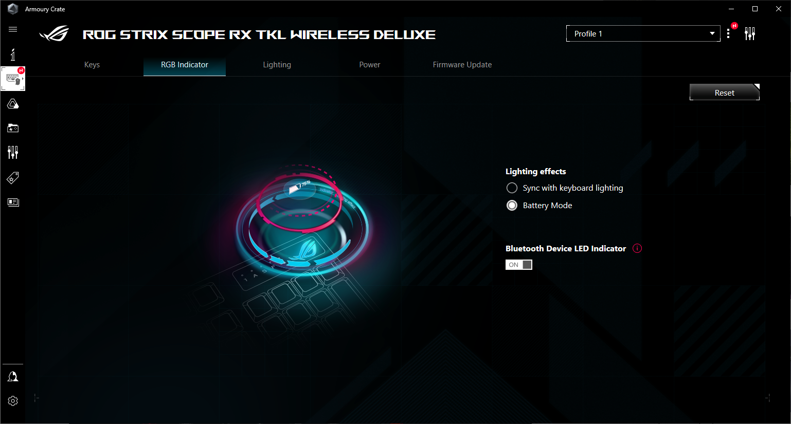 Окремо існує вкладка для налаштування RGB-індикатора, вбудованого в логотип. Йому можна задати два режими роботи: 1) синхронізацію з підсвіткою, 2) роботу як індикатора рівня заряду. Крім того, можна так само налаштувати підсвітку кнопок «8», «9», та «0». Або повторювати загальну підсвітку, або в Bluetooth режимі білим кольором показувати, який саме пристрій приєднано.