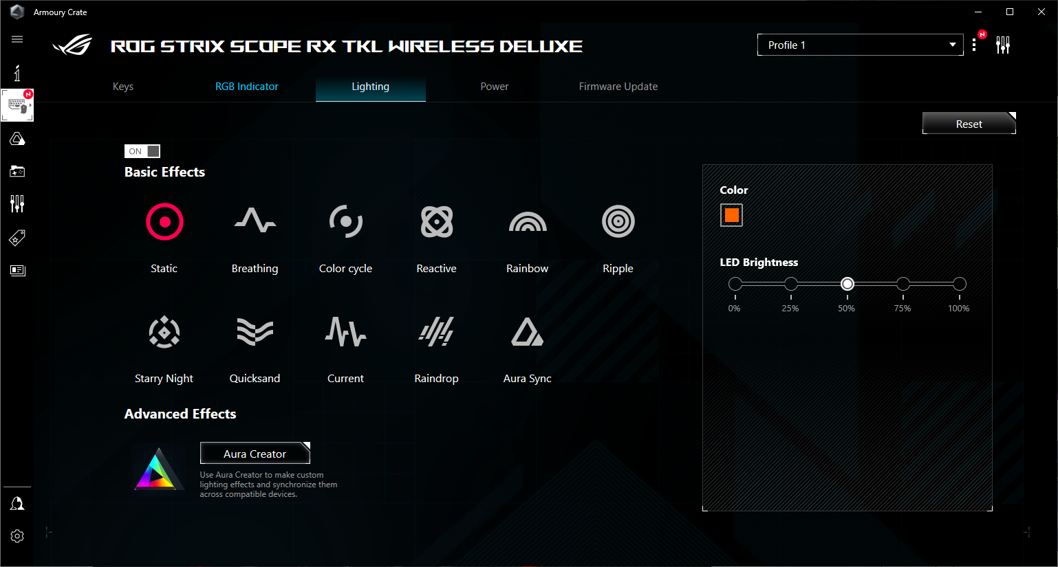В налаштуваннях підсвітки доступні 11 видів ефектів включно зі статичним підсвічуванням. Підсвітку можна відключити повністю. Для індивідуального налаштування підсвітки кожної кнопки потрібно буде завантажити програму Aura Creator.