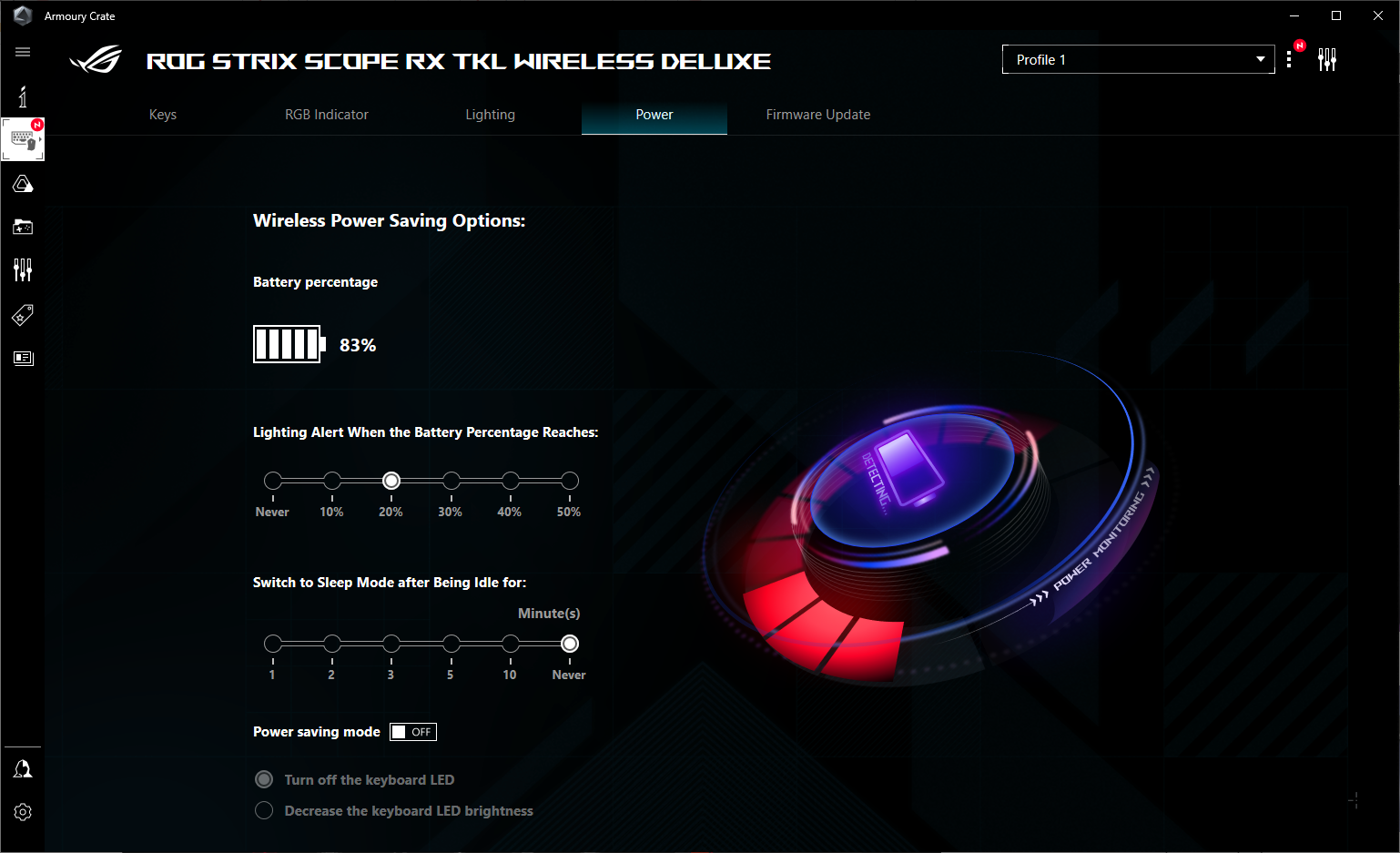 Виробником заявлено 76 годин роботи клавіатури з підсвіткою через приймач в режимі 2,4 ГГц. Щоб перевірити це твердження на практиці я провів два варіанти випробування. В першому були виставлені максимально агресивні налаштування енергоощадження — відключення через 1 хвилину простою підсвітки разом з клавіатурою та 50% яскравості підсвітки (цього насправді цілком досить). У такому варіанті для повного розряду батареї знадобиться приблизно чотири тижні по 6–8 годин роботи на день. В другому, більш енерговитратному режимі, клавіатура була налаштована без ніякого режиму очікування чи відключення підсвітки (окрім коли ПК вимикався на ніч), та також 50% яскравості підсвітки. В такому темпі клавіатури вистачило на 80 годин неперервного використання. Тому заявлену виробником автономність, хоча б для нової батареї, можна вважати реальною.