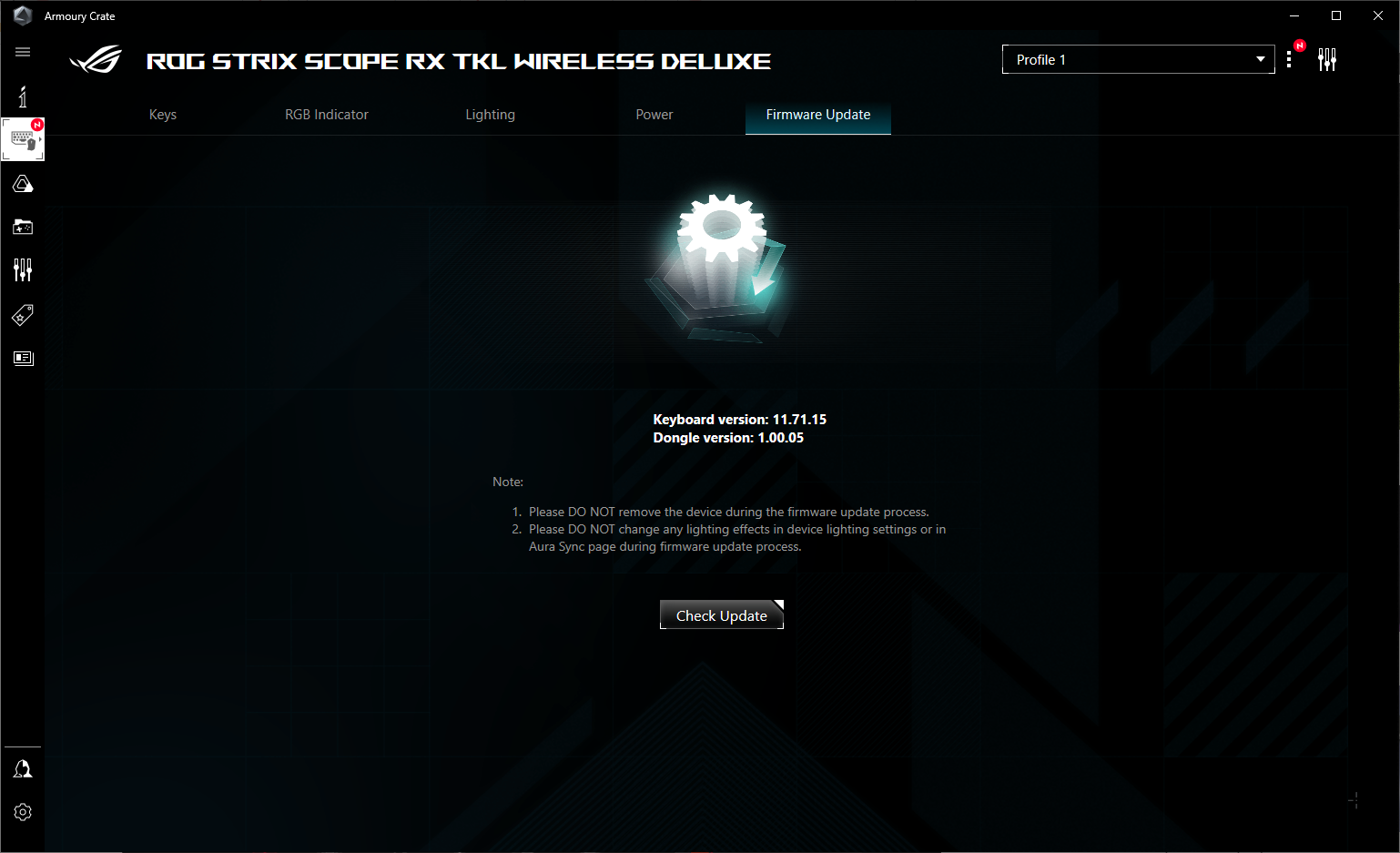 В розділі «Оновлення прошивки» відбувається перевірка версії прошивки клавіатури та приймача, та їх оновлення за потреби. Актуальні версії мікропрограм під час написання цього огляду видно на картинці.