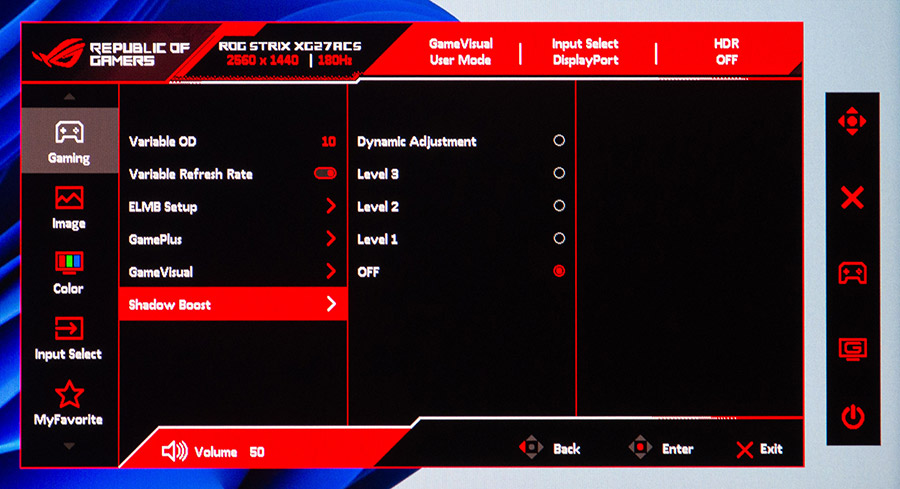 Меню викликається за допомогою п’ятипозиційного джойстика, який розташовано на задній стороні монітора справа від користувача. Дизайн меню має сучасний вигляд та виконаний у червоному кольорі, що відповідає серії ROG. Зверху бачимо назву пристрою, його роздільну здатність та поточну частоту оновлення, профіль монітора, порт під’єднання до відеокарти та функціонування технології HDR. Зліва розміщені розділи меню, перший з яких — Gaming. В ньому знаходяться налаштування розгону матриці, керування адаптивної синхронізації та ELMB. Також там є підрозділ з ігровою функціональністю на кшталт лічильника fps, перехрестя чи снайперського прицілу, таймеру тощо.