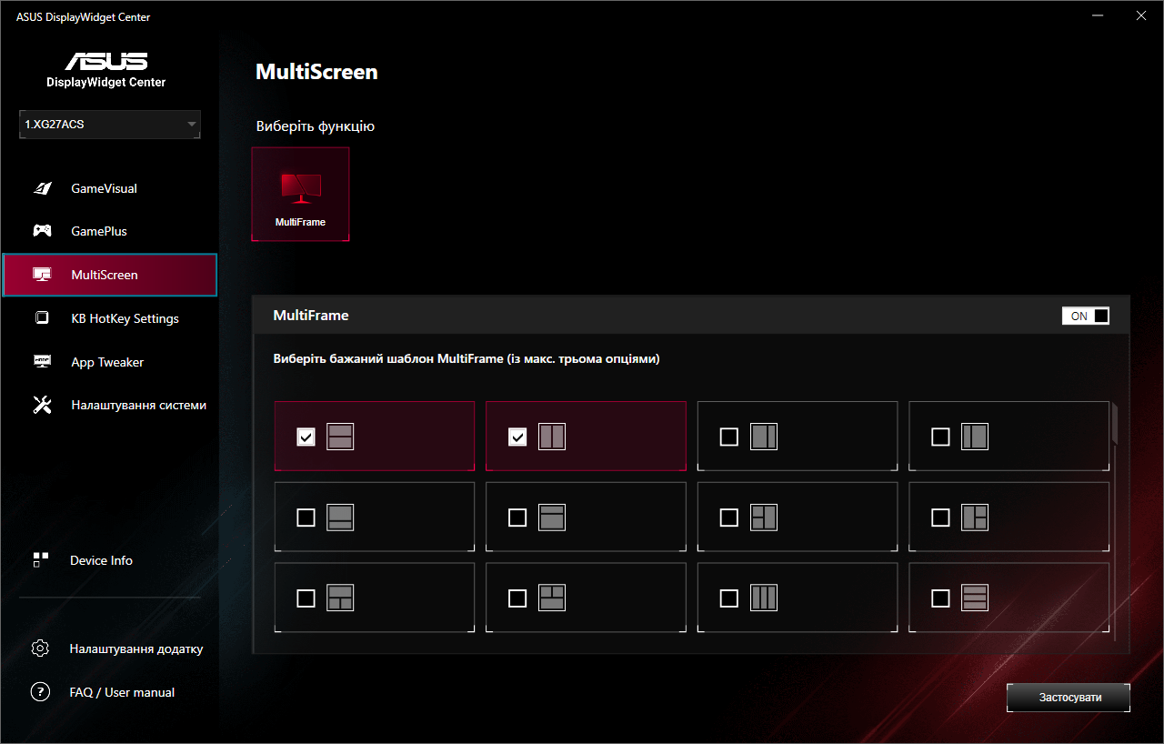 Програмна підтримка монітора зводиться до завантаження з сайту ASUS драйвера з колірним профілем та застосунку DisplayWidget Center, який має три варіанти оформлення та дозволяє налаштувати параметри екрана з-під Windows.