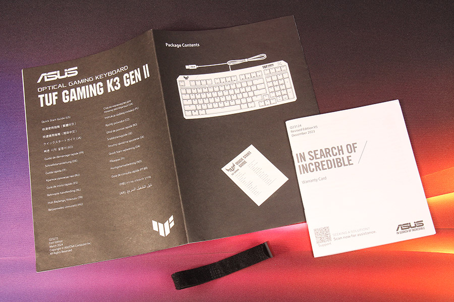 Комплектація мінімальна та відповідає статусу продукту внизу й так нефлагманської лінійки TUF Gaming — окрім самої клавіатури, в коробці є лише документація та стяжка-липучка для кабелю: