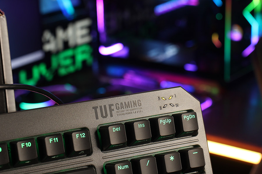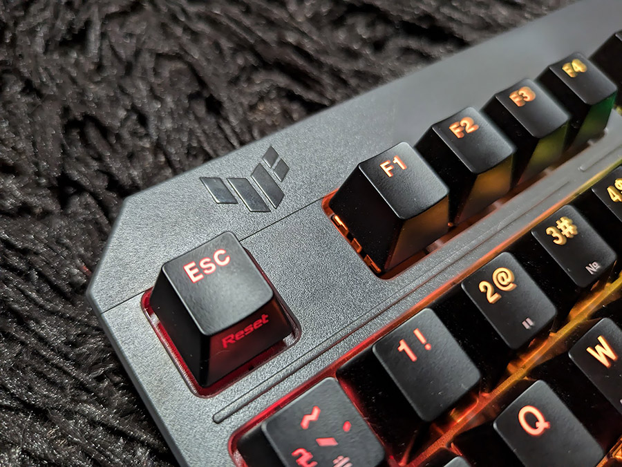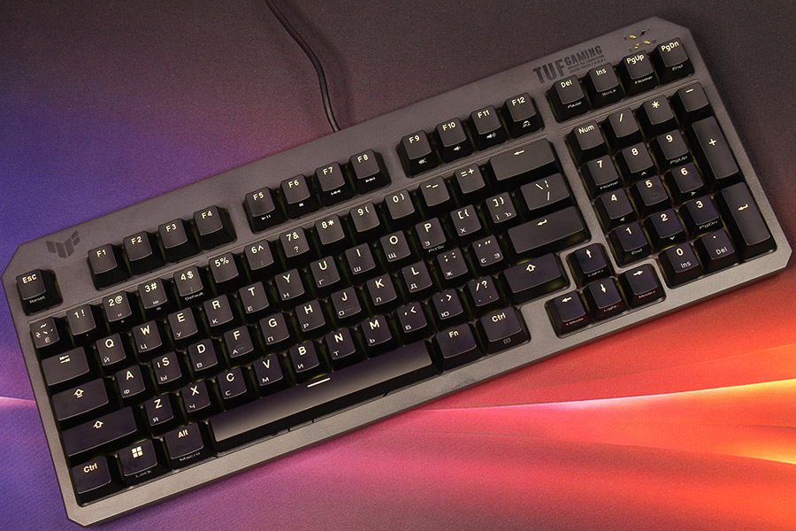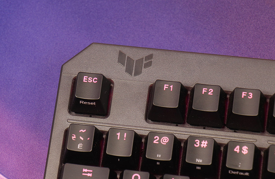 Індикатори натискання LOCK-клавіш розміщено у правому верхньому кутку поруч з логотипом TUF Gaming. Ще одна емблема присутня біля клавіші Esc.