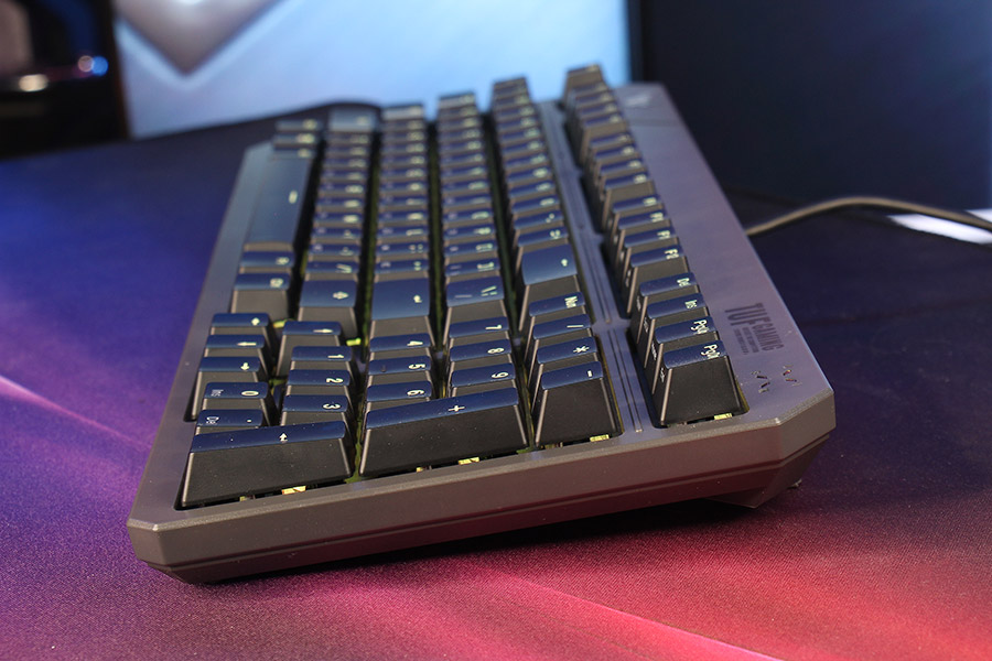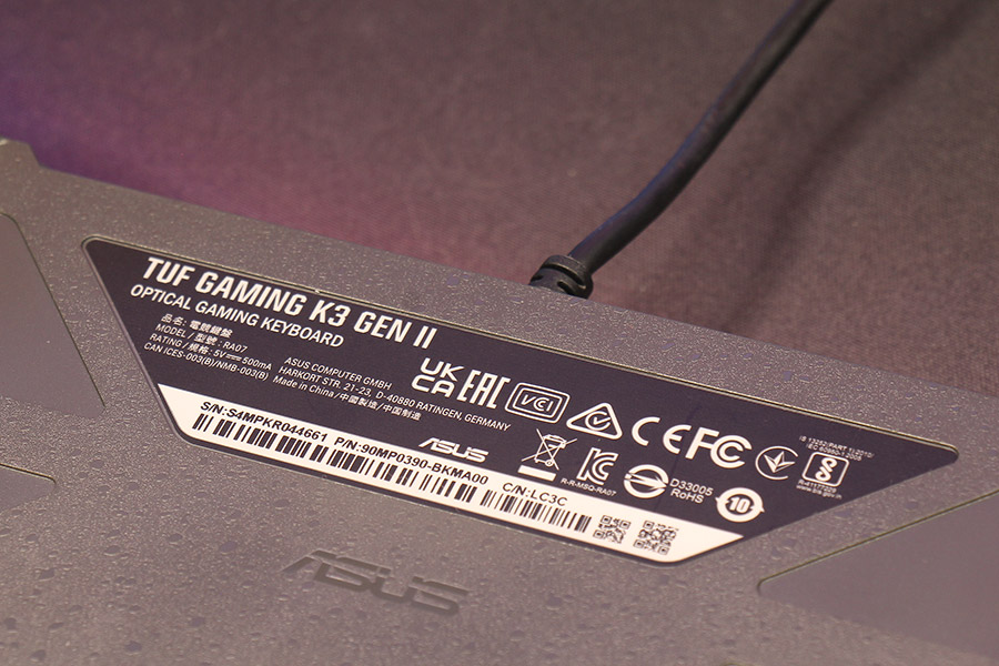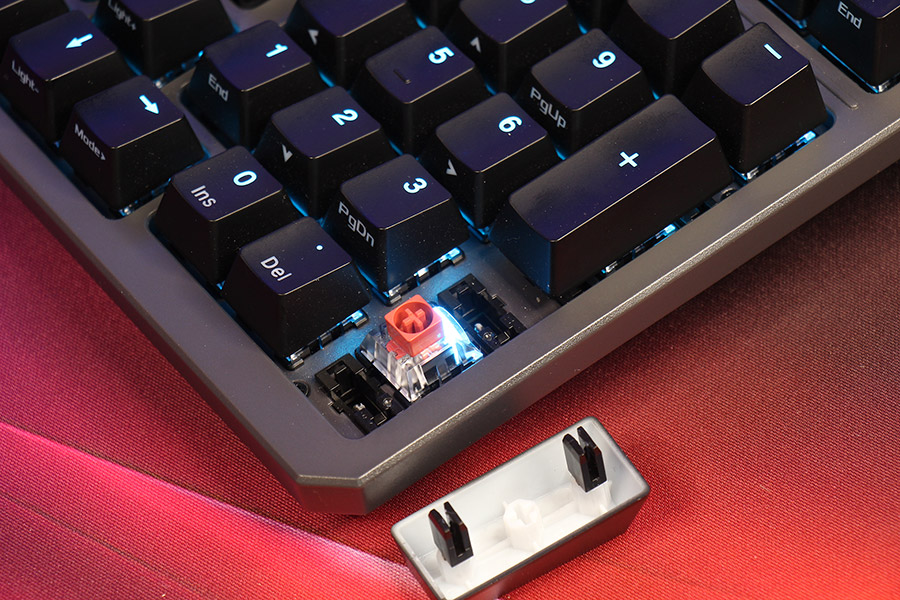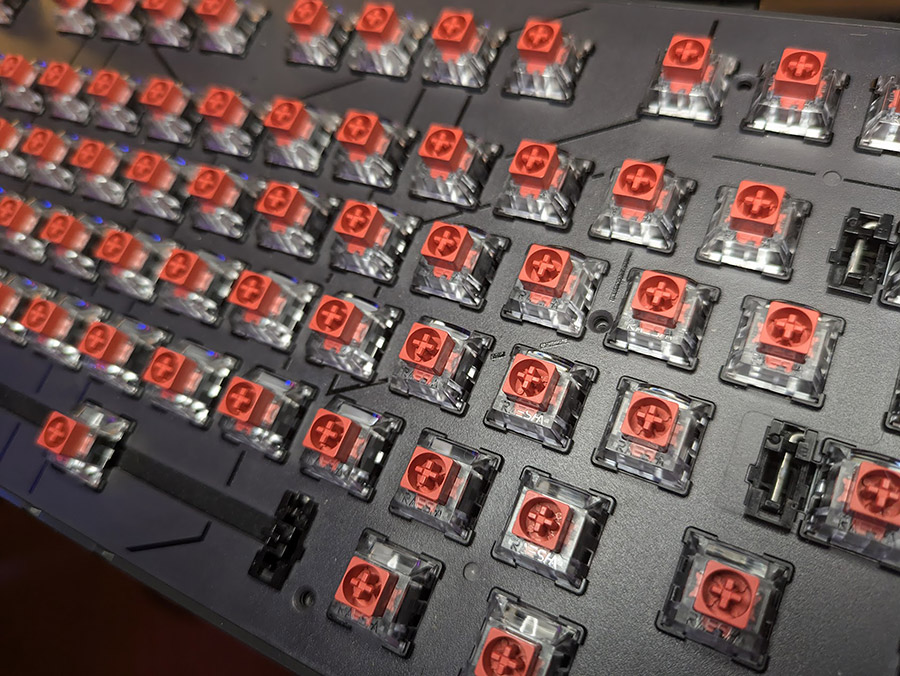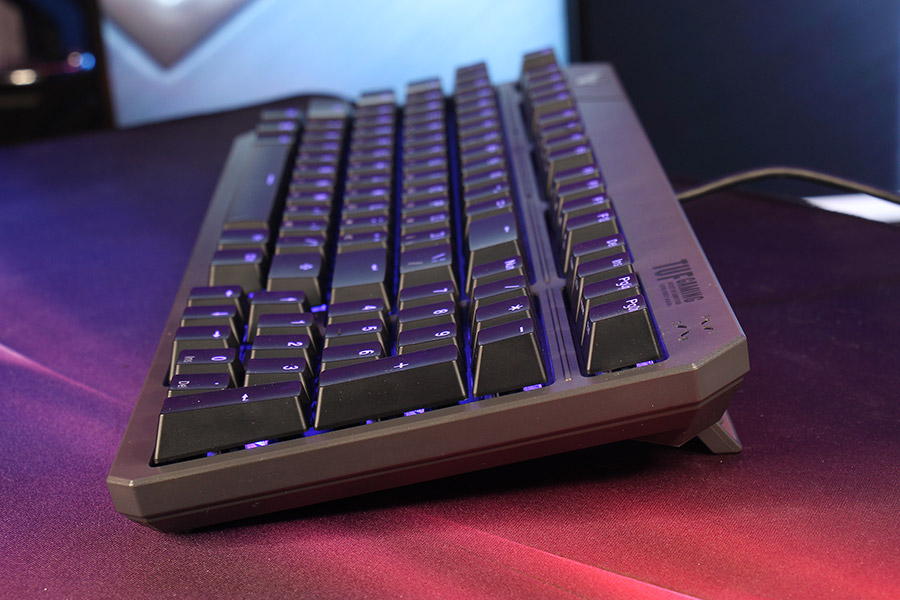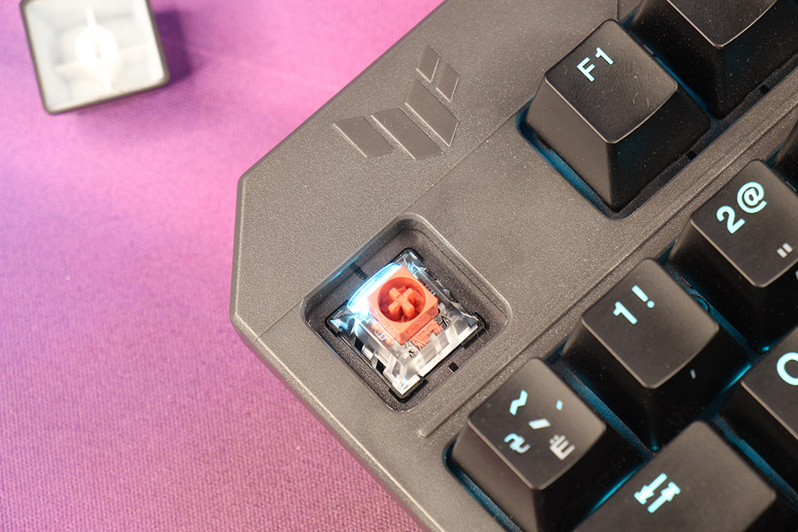 Ми розглядаємо варіант з лінійними Red, які мають повний хід 4 мм, хід до спрацьовування 1,8 мм та силу натискання у 35 г. Також є варіант TUF Gaming K3 Gen II з тактильними перемикачами Blue з силою натискання 55 г. При використанні до перемикачів не було жодних нарікань, вони мають приємний плавний хід та дуже швидкий відгук, що особливо важливо при грі у швидкі шутери чи екшени. Інформації про змащення в описі немає, але помітного «піску» в клавішах не відчувається, а при огляді помітний невеликий шар мастила.