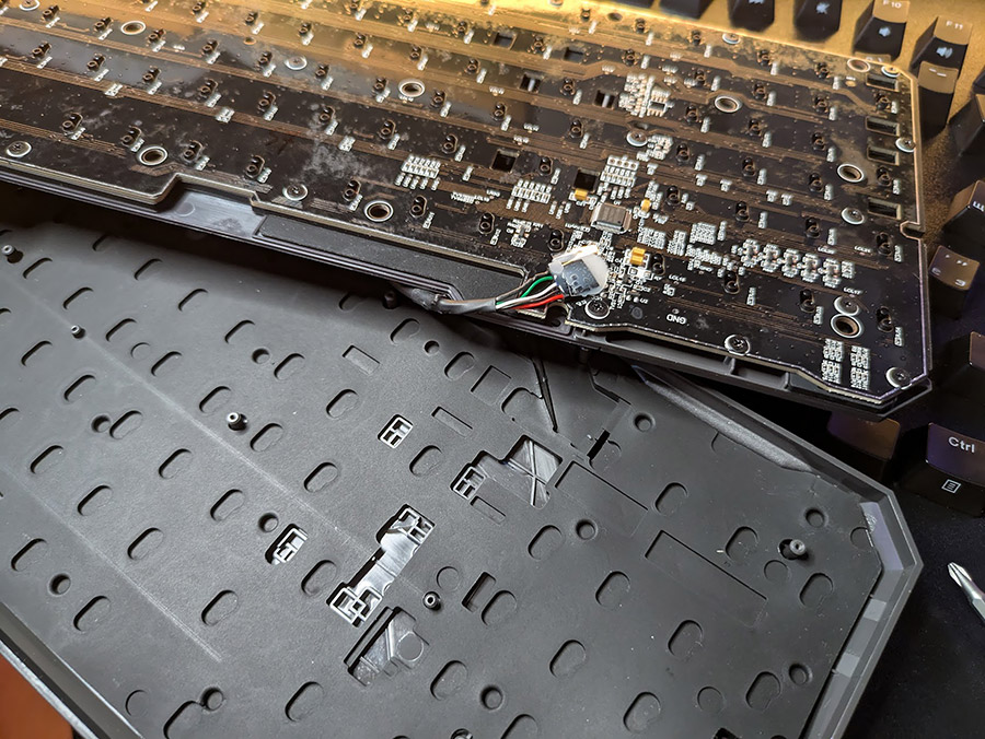 Для підключення використовується незнімний 2-метровий кабель з силіконовою ізоляцією, який входить в клавіатуру посередині та припаяний до друкованої плати. Це одна з деталей, на якій виробник відчутно економить, що важливо для продукту нижчого рівня в лінійці. Разом з тим, користувачі також це відчувають, особливо через роки експлуатації, якщо потрібно міняти кабель… Для акуратнішого кабель-менеджмента кабель можна зафіксувати під одним із відповідних виступів на верхній кришці.
