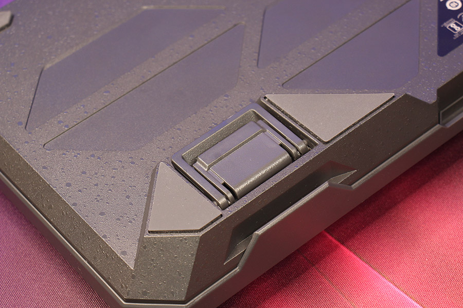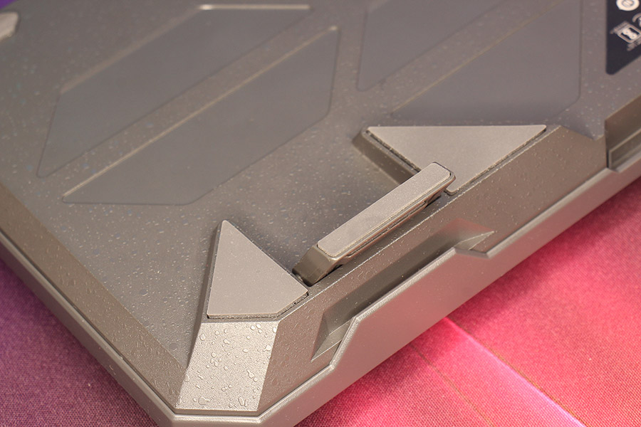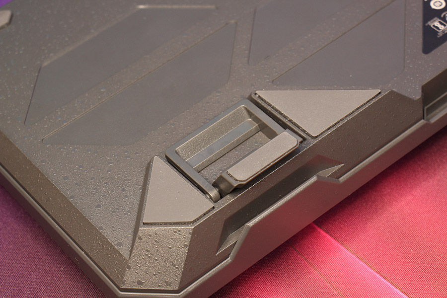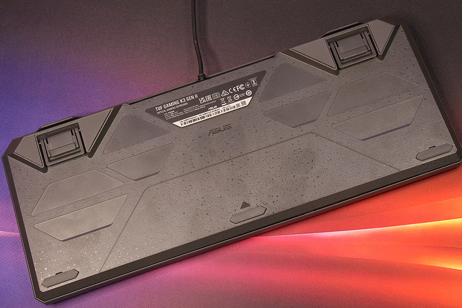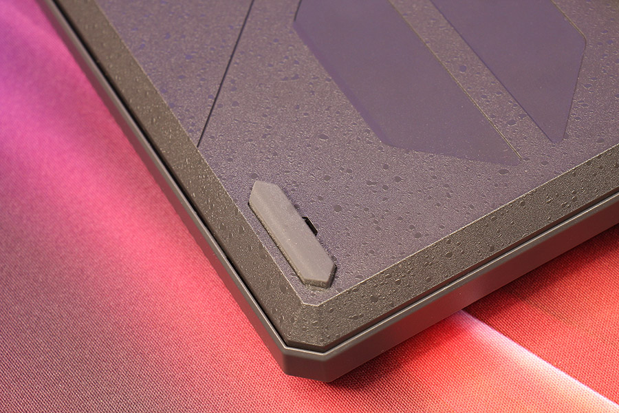 Нижня частина клавіатури також темно-сіра, з геометричним візерунком та текстурою у вигляді крапель води. Тут розташовані сім масивних гумових вставок для запобігання ковзанню, а також дворівневі ніжки, які дозволяють регулювати кут нахилу клавіатури.