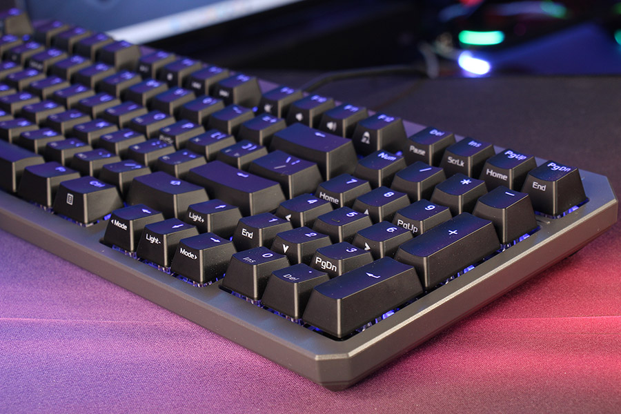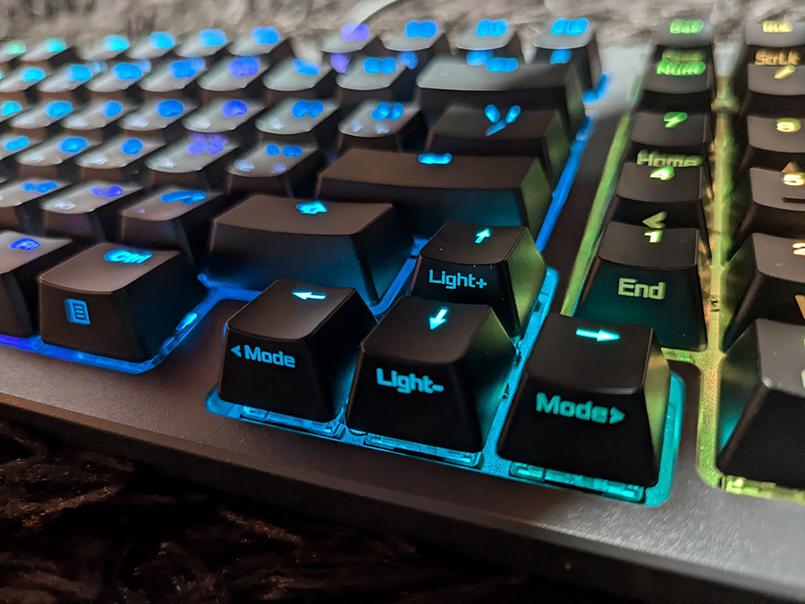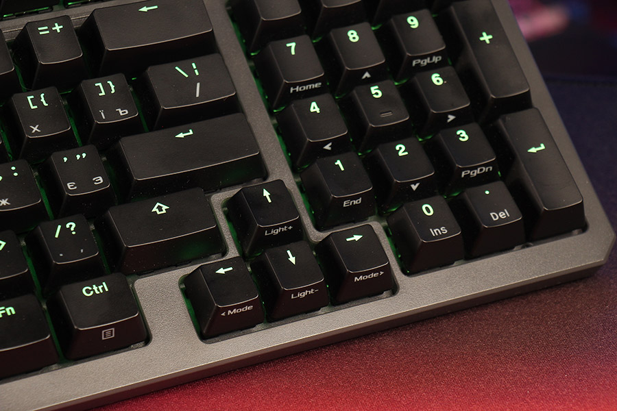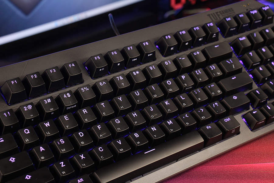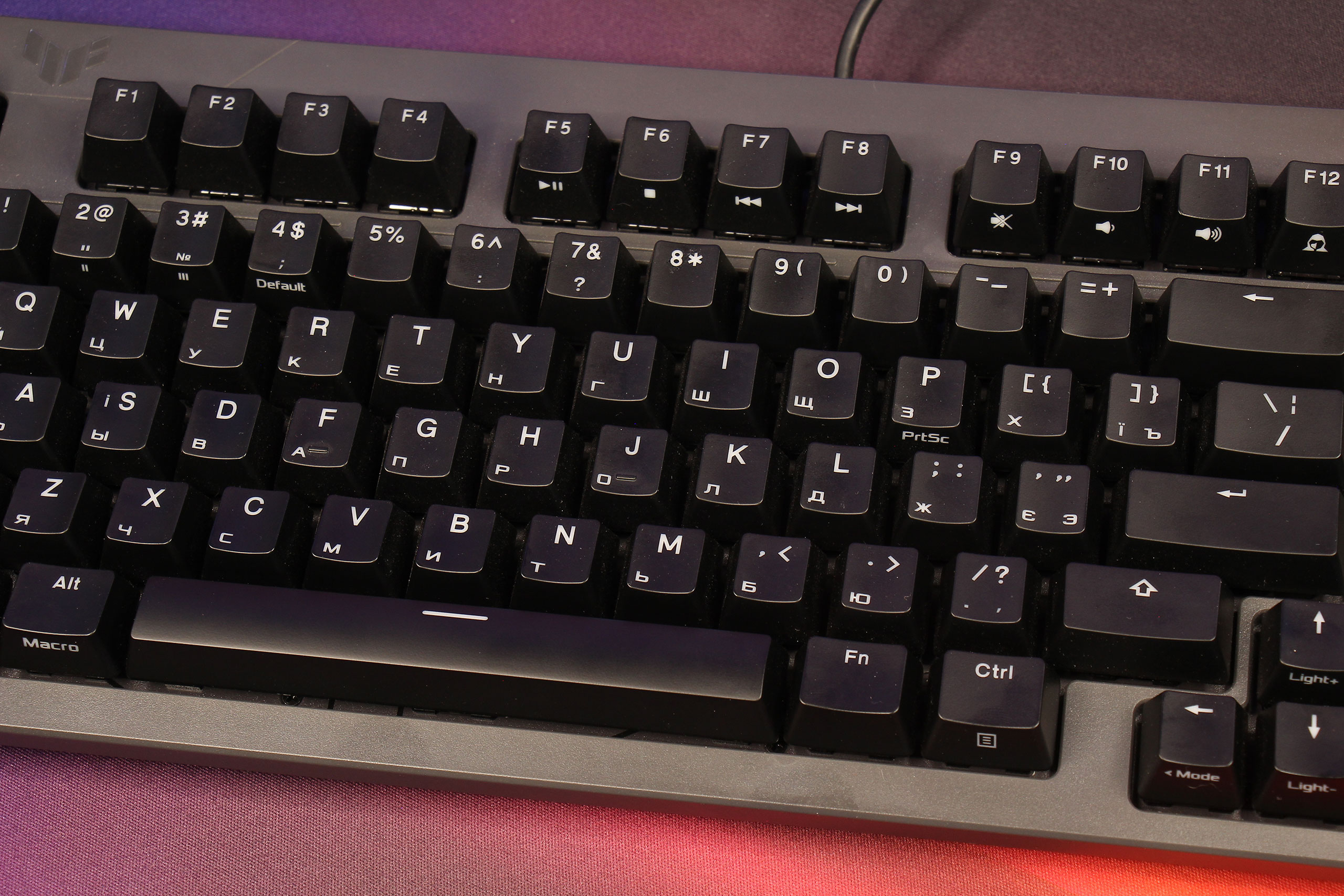 Додатково, деякі клавіші мають ще маркування на боковій частині ковпачків, бо є ціла купа функцій, які можна виконувати за допомогою Fn + «потрібна клавіша» без інсталяції Armoury Crate. Ці функції позначені на передній стороні кейкапів. Наприклад, Fn + цифри від 1 до 4 перемикають профілі, Fn + F5–F8 керують медіа, Fn + Alt — робить запис макросу, а Fn + стрілки відповідає за регулювання підсвітки.