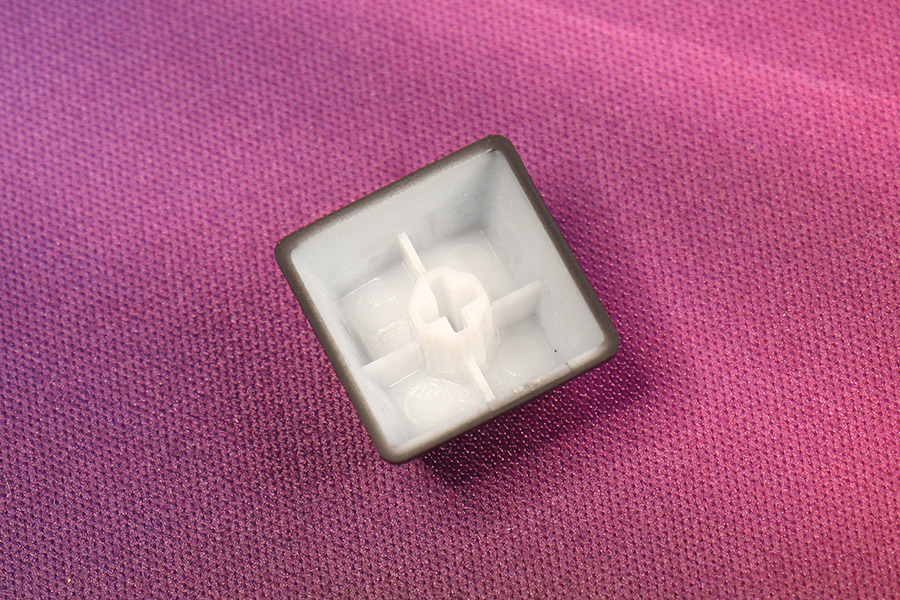 Кейкапи ABS з подвійним литтям мають потрійну розкладку. В ідеальному для підсвічування місці зверху по центру розміщується більшим шрифтом символи англійської розкладки, а українські — знизу, меншим шрифтом. Всі літери підсвічуються повноцінно в тому сенсі, що додаткові розкладки зроблені не гравіюванням, але символи в нижній частині клавіш банально отримують менше світла від світлодіодів.