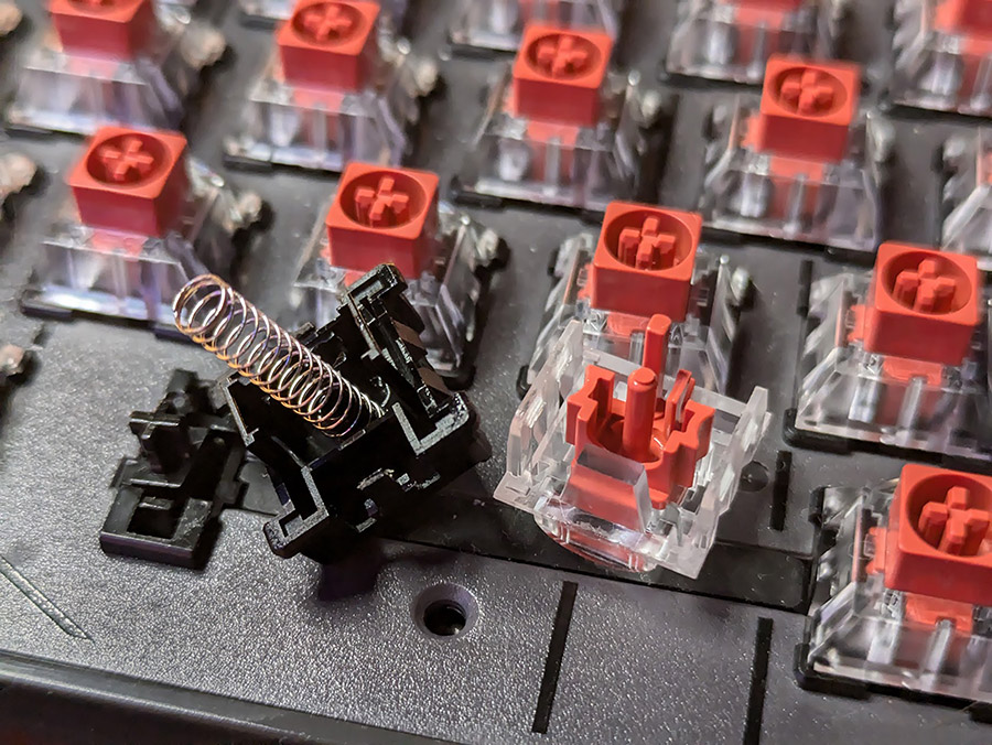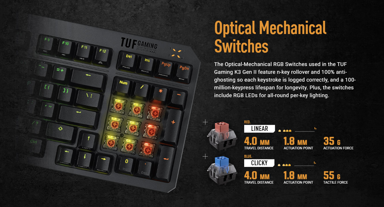 ASUS TUF Gaming K3 Gen II використовує оптико-механічні перемикачі з заявленим ресурсом у 100 мільйонів натискань. «Оптичність» тут передбачає те, що замість замикання металевих контактів для реєстрації натискання використовується переривання променя, що зменшує затримку та збільшує термін служби. При цьому за відчуттями перемикачі не відрізняються від традиційних механічних, адже в цілому зроблені у форматі Cherry MX: така сама конструкція з нижньою та верхніми половинками корпусу, штоком (стемом) з хрестовиною зверху та пружиною, яка визначає силу натискання.