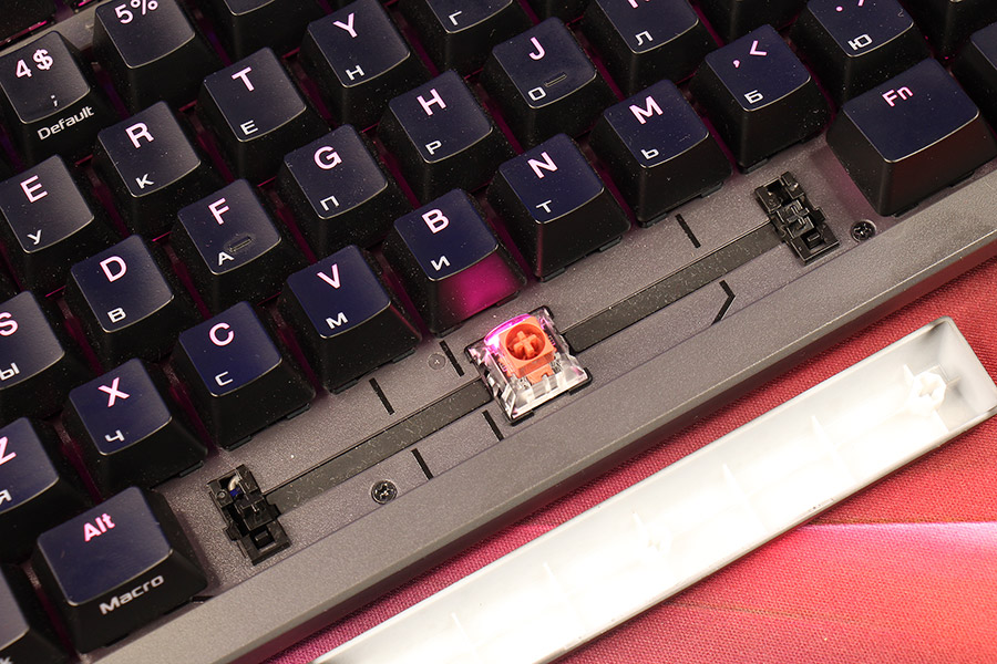 Під довгими клавішами встановлені plate-mount стабілізатори більш рідкісного нині типу Costar. Пробіл хитається зовсім трохи, а обидва Shift — ні.