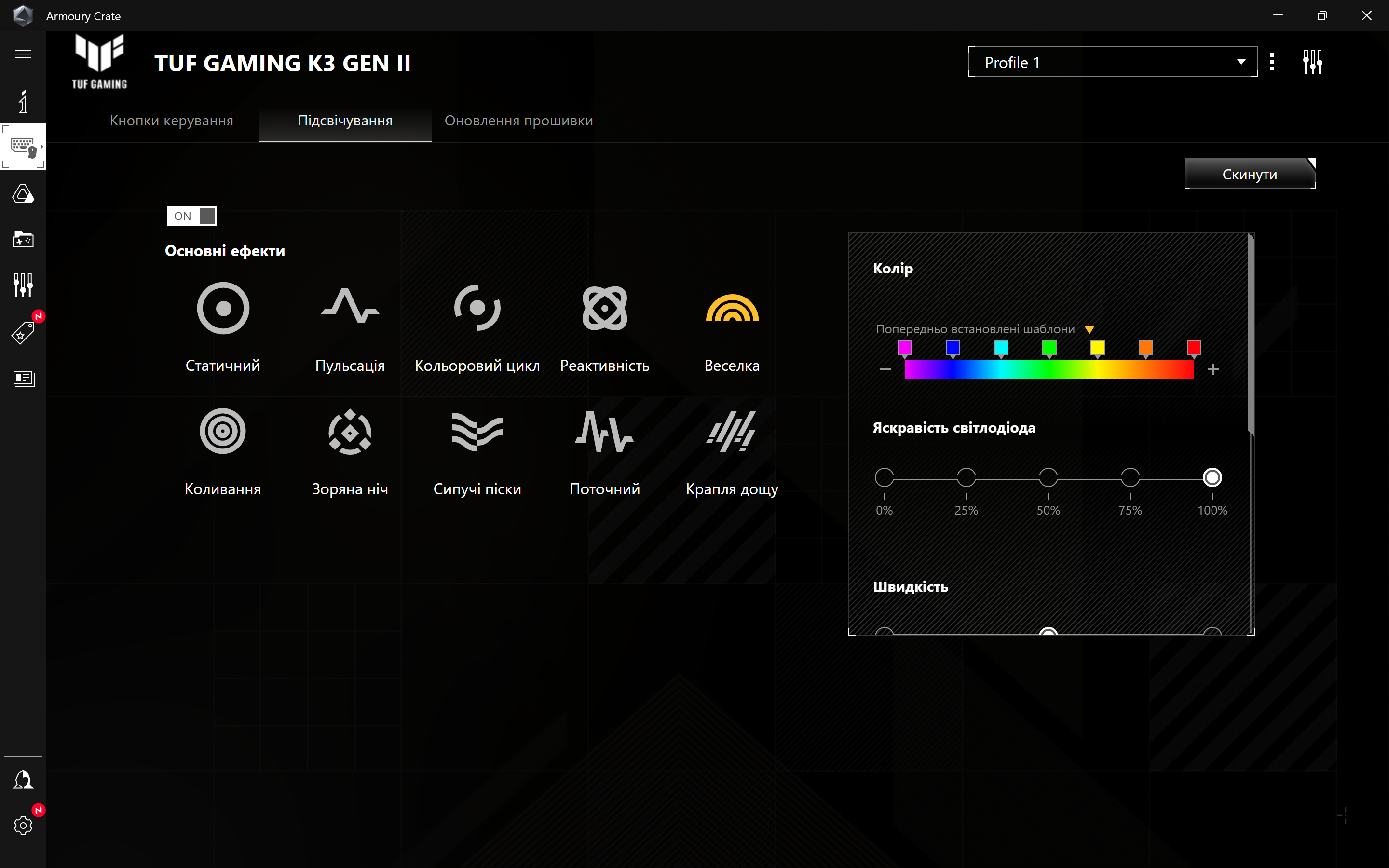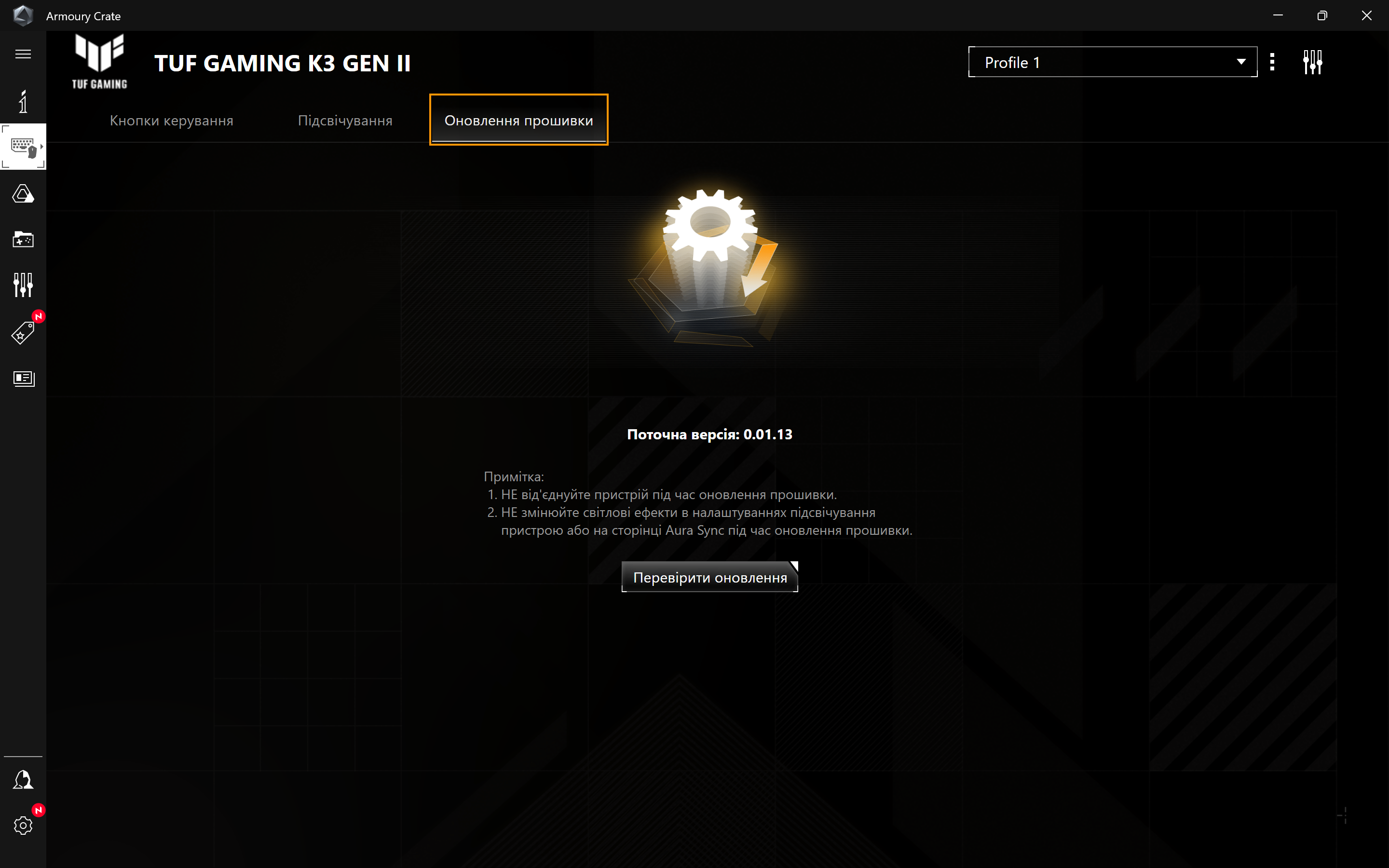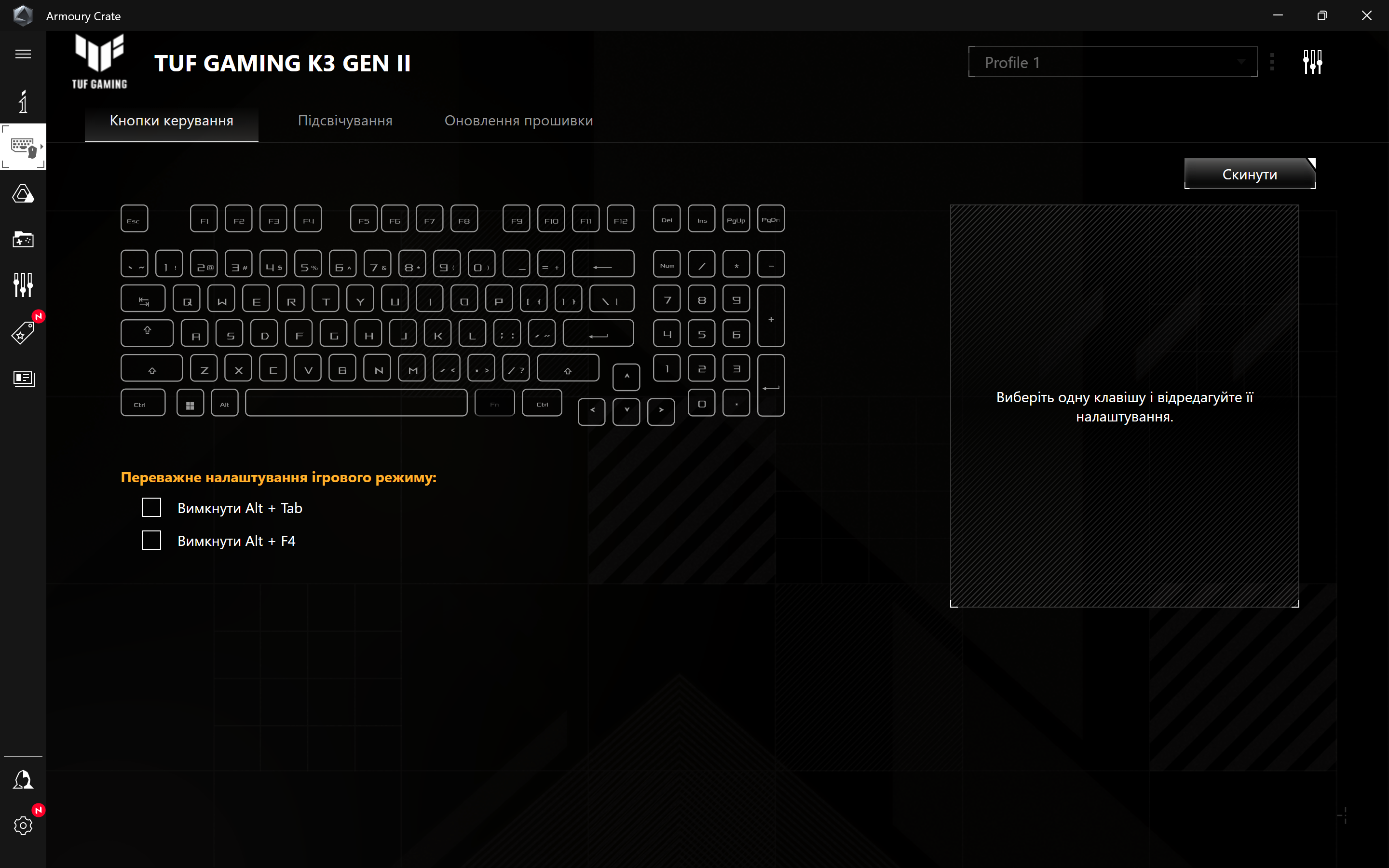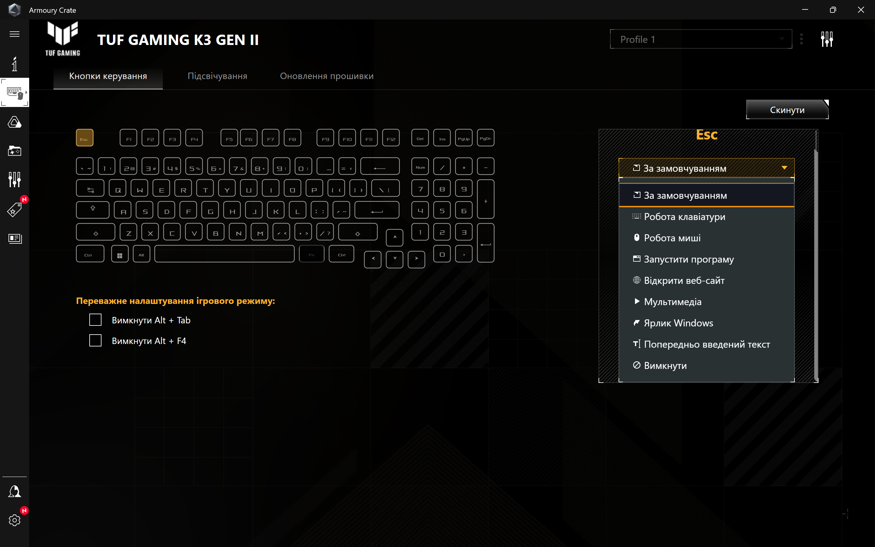 Параметри ASUS TUF Gaming K3 Gen II знаходяться в окремому розділі «Пристрій». Перша вкладка відповідає за призначення дій або макросів на клавіші, а також відключення комбінацій Alt+Tab та Alt+F4. У другій вкладці можна налаштувати підсвітку (ефекти та яскравість). Третя вкладка призначена для оновлення програмного забезпечення. Список профілів знаходиться у верхньому правому куті.
