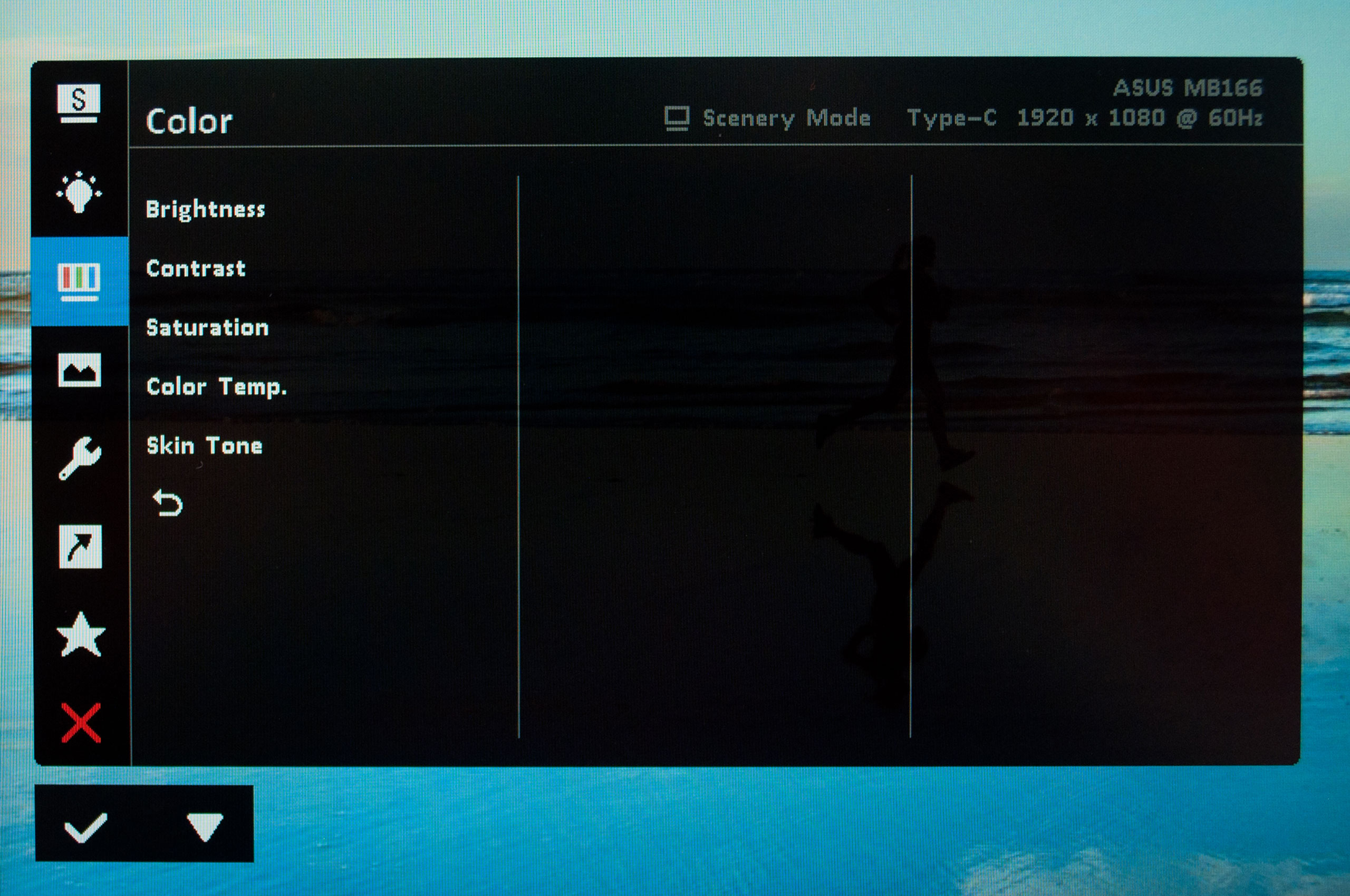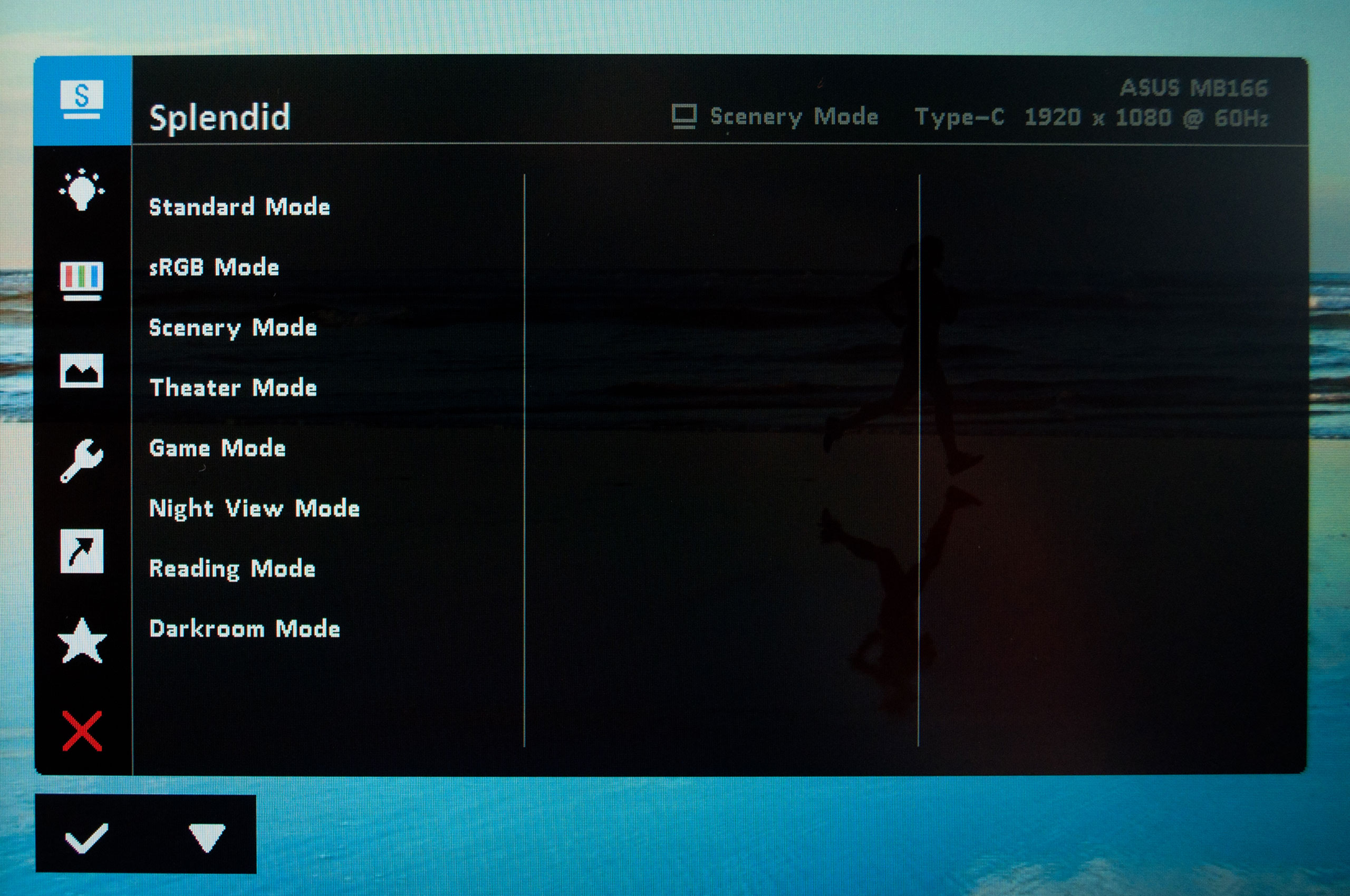 Оскільки портативний монітор ASUS ZenScreen MB166CR оснащений всього двома клавішами управління, то меню керування має специфічну будову, а навігація по ньому вимагає певного звикання. Вхід в меню відбувається натисканням лівої кнопки, вона також слугує для вибору вкладки, тоді як права клавіша — функціональна — призначення для підтвердження вибору. Стартова сторінка називається Splendid, вона призначена для вибору одного з восьми попередньо заданих наборів налаштувань зображення, які відповідають типовим сценаріям використання.