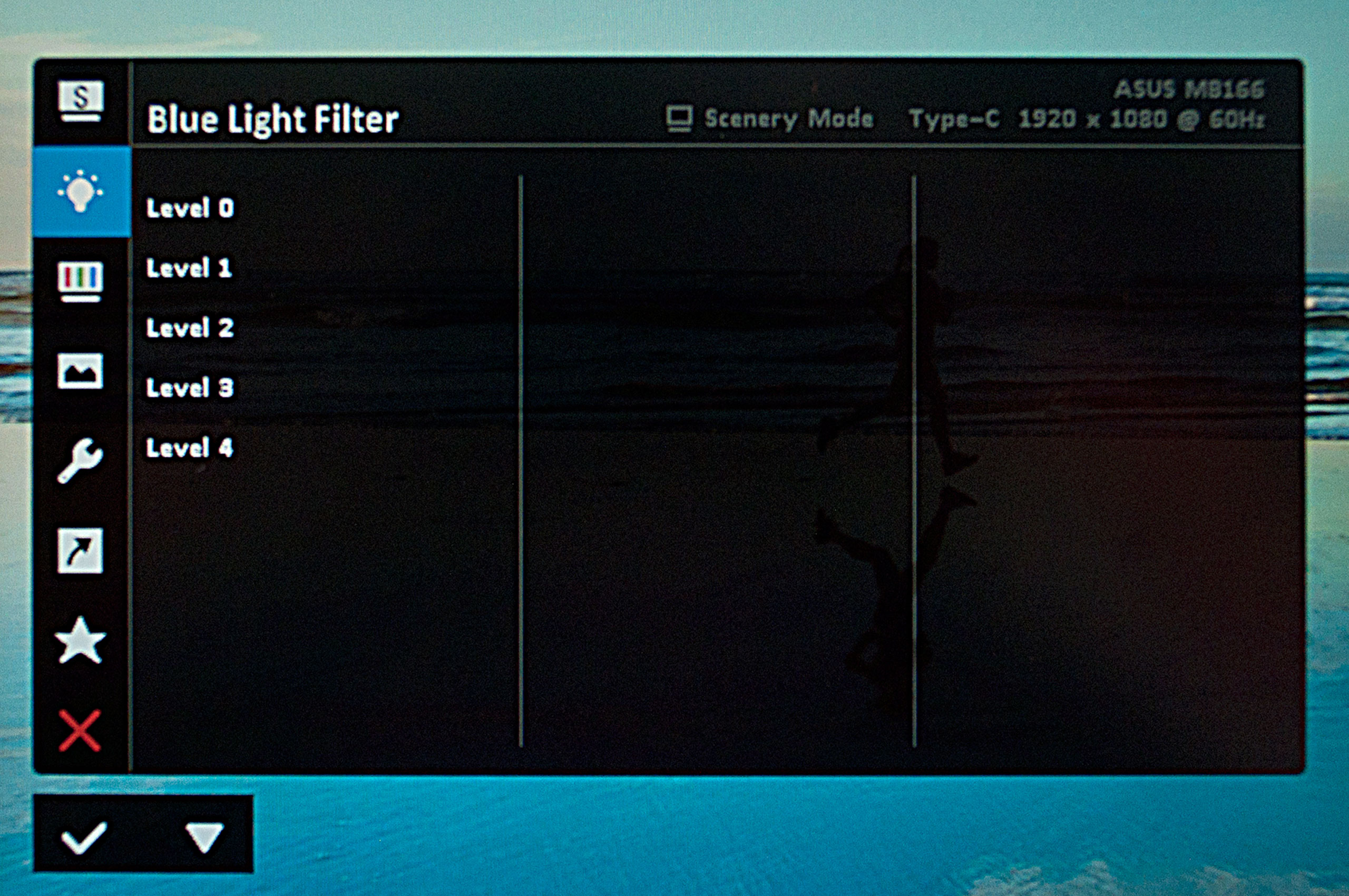 Наступний пункт меню Blue Light Filter відповідає за включення фільтра синьої компоненти зображення і керування його інтенсивністю. Ця функція покликана зменшити втому від тривалої роботи за монітором, особливо в юних користувачів.