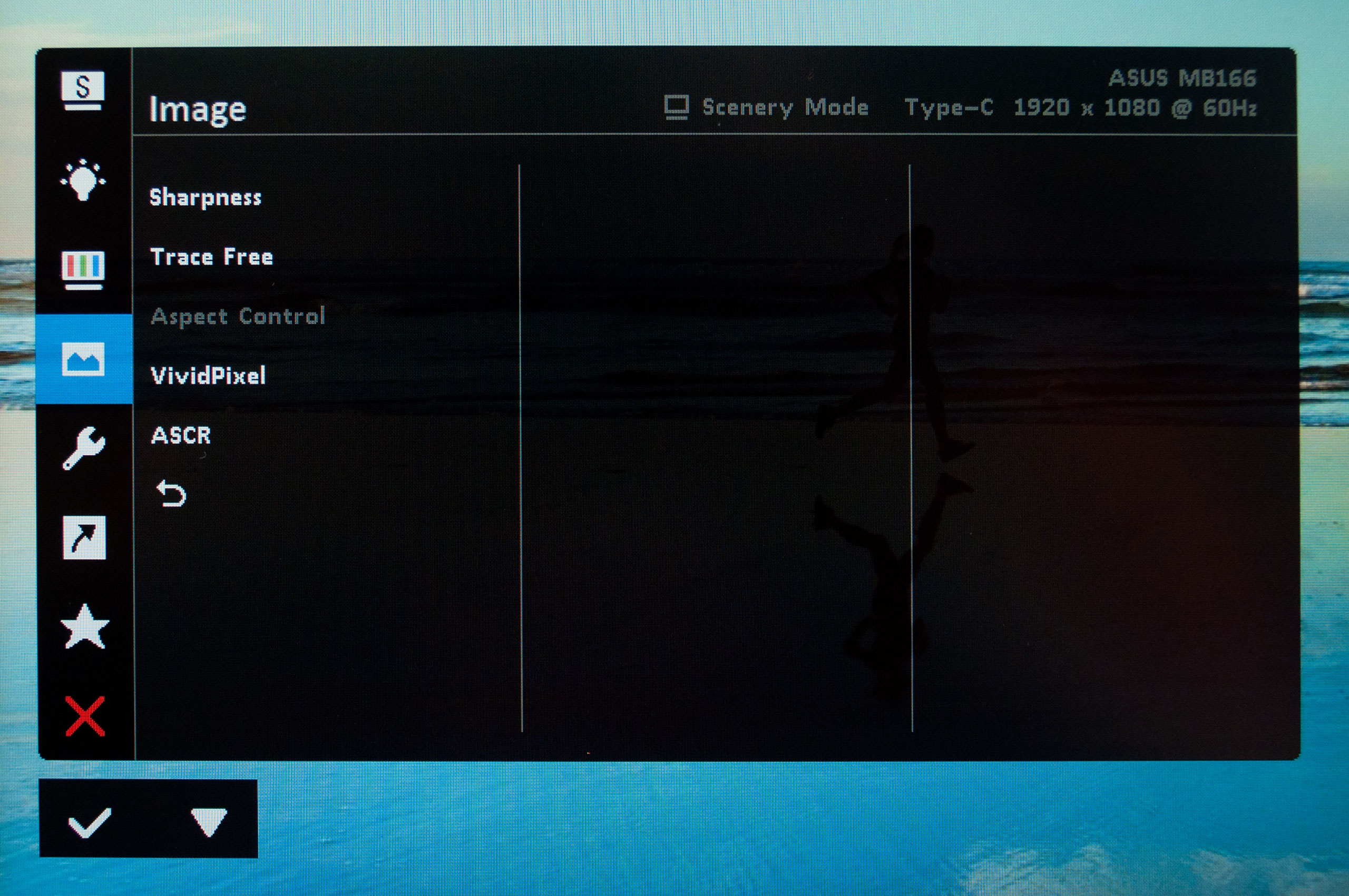 Вкладка Image дозволяє керувати чіткістю зображення, функцією прискорення матриці Trace Free, VividPixel для покращення деталізації картинки, а також ASCR (ASUS Smart Contrast Ratio) для покращення показників контрастності.