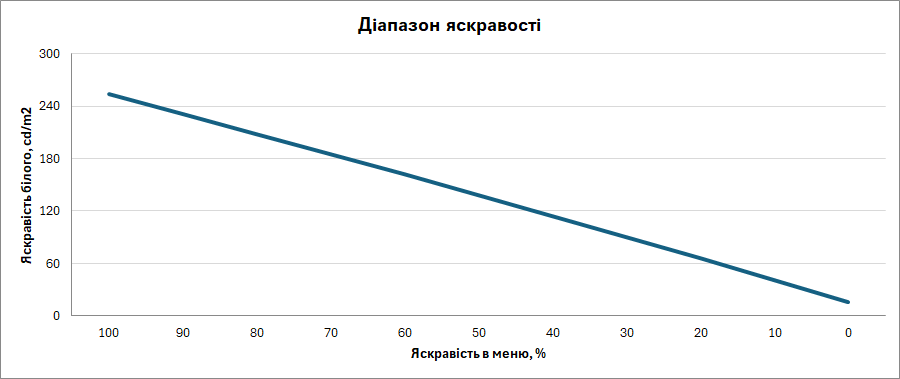 Для початку була оцінена відповідність заявлених характеристик яскравості й контрастності матриці. Вимірювання проводилися для набору налаштувань Standard mode, а яскравість регулювалася в меню з інтервалом в 10 кроків. Вимірювання продемонструвало максимальну яскравість у 254 кд/м², яка виявилася навіть трохи краще від заявленого значення. А ще яскравістю зручно керувати: залежність рівня від налаштувань майже лінійна.