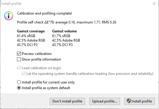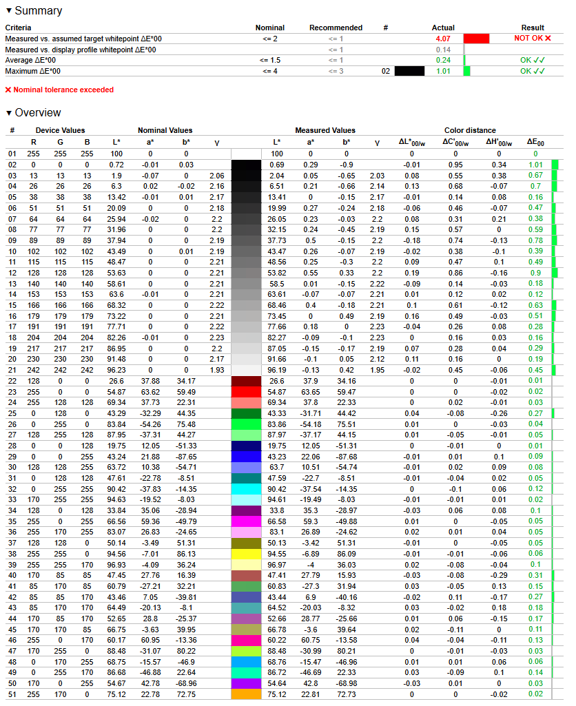 Втім, навіть за фабричними налаштуваннями дисплей демонструє відмінні показники DeltaE: середнє значення значно менше за одиницю, а максимальне не перевищує 1,08.