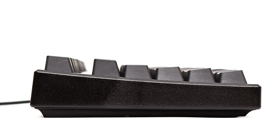 Розкладка клавіш звичайної висоти виконана за стандартом ANSI з довгими однорядними Shift та Enter. Кнопка F1 розташована над цифрою «2». Цікава та досить рідкісна для клавіатур «фішка» — символи нанесені шляхом сублімації на передню грань ковпачків клавіш, а не на верх, як завжди. Розрахунок тут на те, що користувач все одно бачить клавіатуру під кутом, отже йому видно і фронтальну грань. Верхня частина постійно знаходиться в зоні контакту і стирання від дотику пальців. Загалом, з одного боку, рішення вдале, а з іншого — з вирівнюванням по центру надрукована лише латиниця, кирилиці немає зовсім. У темряві символи майже не помітні — немає наскрізного підсвічування, фонове світло не відбивається, а свічення між клавішами погіршує видимість ще більше. Одним словом, якщо користувач не володіє сліпим набором, ця клавіатура не найкращий для нього вибір. Профіль клавіш має звичне циліндричне заглиблення. Кнопка Fn займає позицію правої кнопки Win.