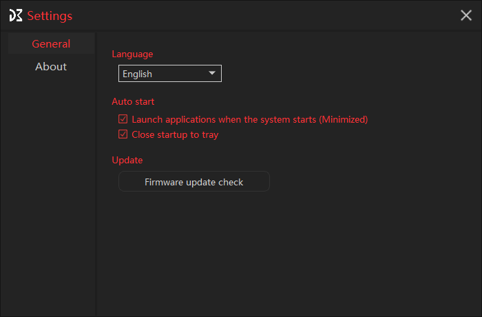 Dream Machines DreamKey використовує власне ПЗ (актуальна версія на момент написання огляду — 1.04.02) для управління підсвічуванням та перепризначення клавіш. Його потрібно завантажити з офіційного сайту та встановити. Можна налаштувати автоматичний запуск разом із системою, або примусово вручну. Можна виконувати запуск як згорнутим у лоток, так й у вигляді повного вікна програми. На вибір є 13 мов інтерфейсу. Оновлення прошивки виробу проводиться примусово вручну.