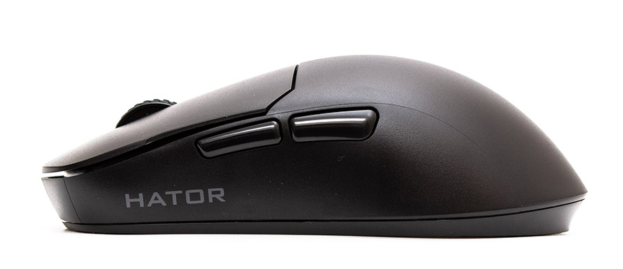 За формою Hator Quasar Wireless не схожа ні на що з асортименту цього бренду. Вона симетрична, з заваленими всередину боковинами та передньою панеллю, а найвища точка спинки зміщена в сторону задньої третини корпусу. Матеріал — гладкий на дотик матовий пластик з невеликим відливом, а колір повністю чорний. Поверхня досить стійка до забруднення та легко відчищається. Панелі ЛКМ та ПКМ окремі від корпусу та мають невеликий люфт у сторони. Вільний хід при натисненні мінімальний. Спрацювання відбувається з голосним клацанням, для активації потребується середній рівень зусилля. Середня кнопка активується тугіше та трохи тихше ніж основні перемикачі. Справа від колеса прокручування у щілинах видно світло схованого всередині інформативного світлодіода, який іноді вмикається.