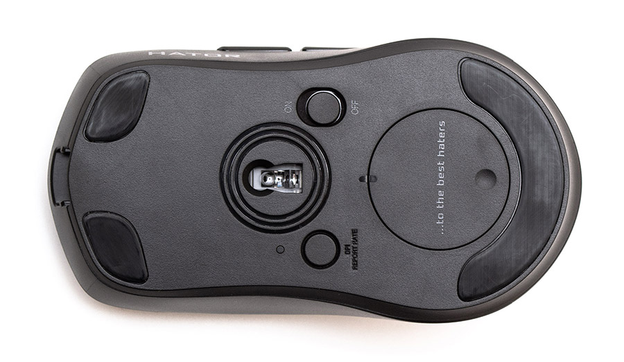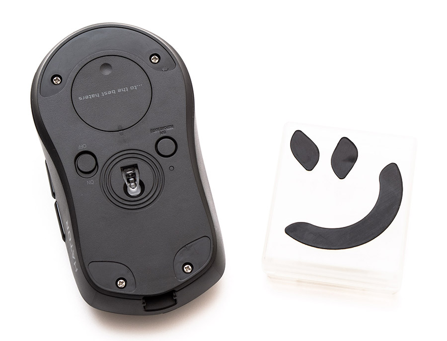 На підошві миші є дві ніжки попереду та одна велика напівкругла позаду. Віконце сенсора розташоване по центру з невеликим зміщенням вперед. Справа від нього є кнопка перемикання рівня роздільної здатності та частоти опитування з кольоровим індикатором над нею (який, до речі, ніколи не відключається). Зліва знаходиться повзунок перемикача живлення.
