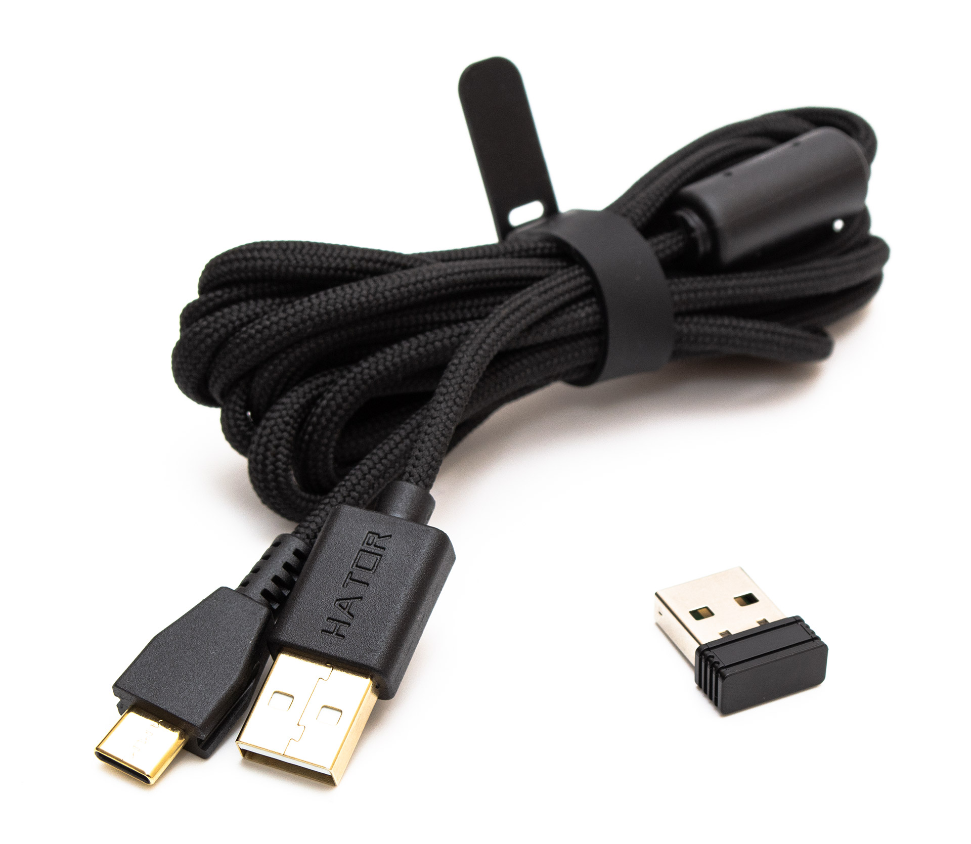 Кабель USB Type C є гнучким і середнім по товщині та м’якості. Він вкритий капроновим обплетенням, має довжину в 1,85 метра та важить 33 грами. Також на ньому присутня феритова накладка ближче до порту USB Type А та резинова застібка для збирання зайвої довжини. USB-приймач простий на вигляд, та, судячи з усього, не здатний працювати у режимі передавача.