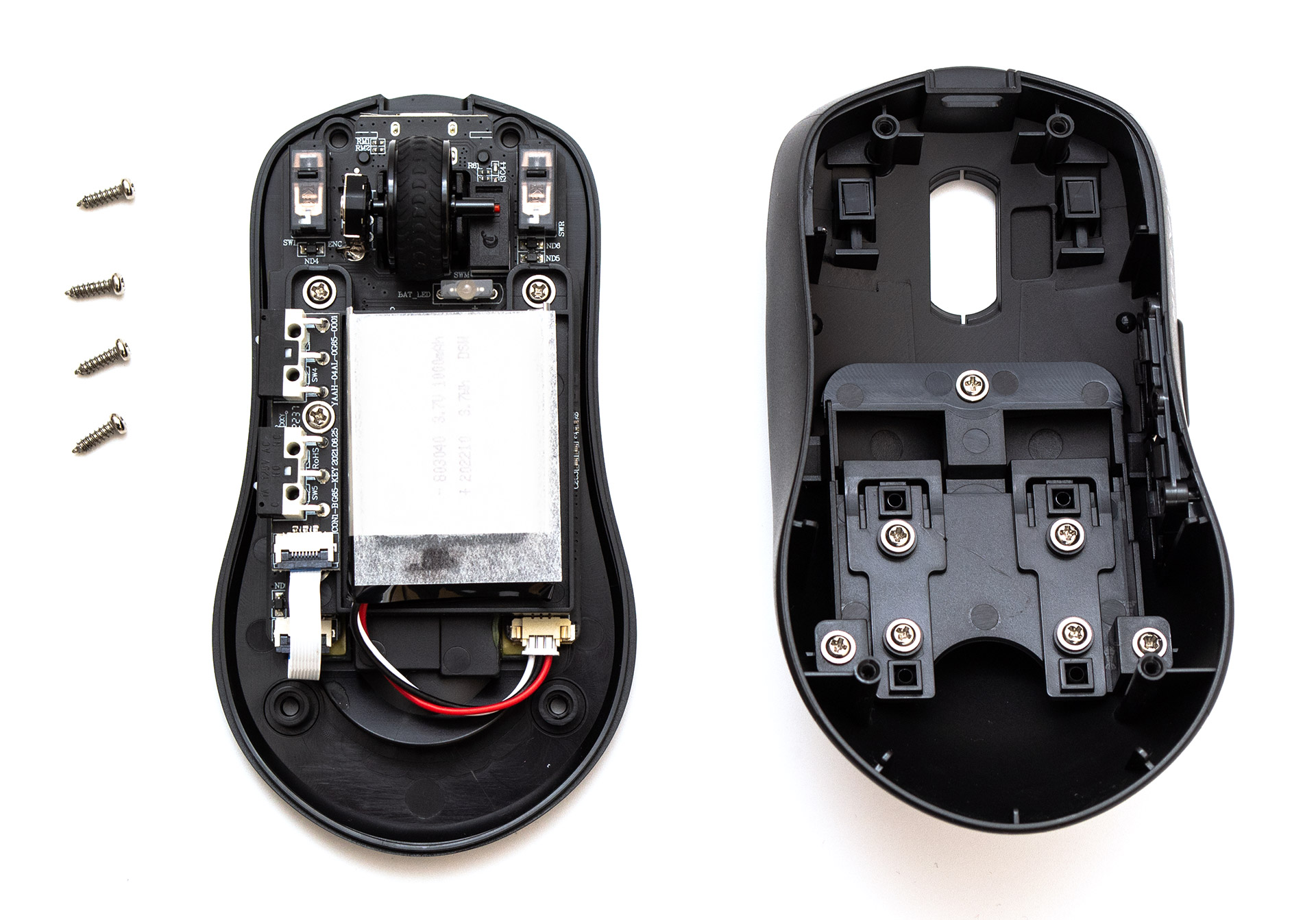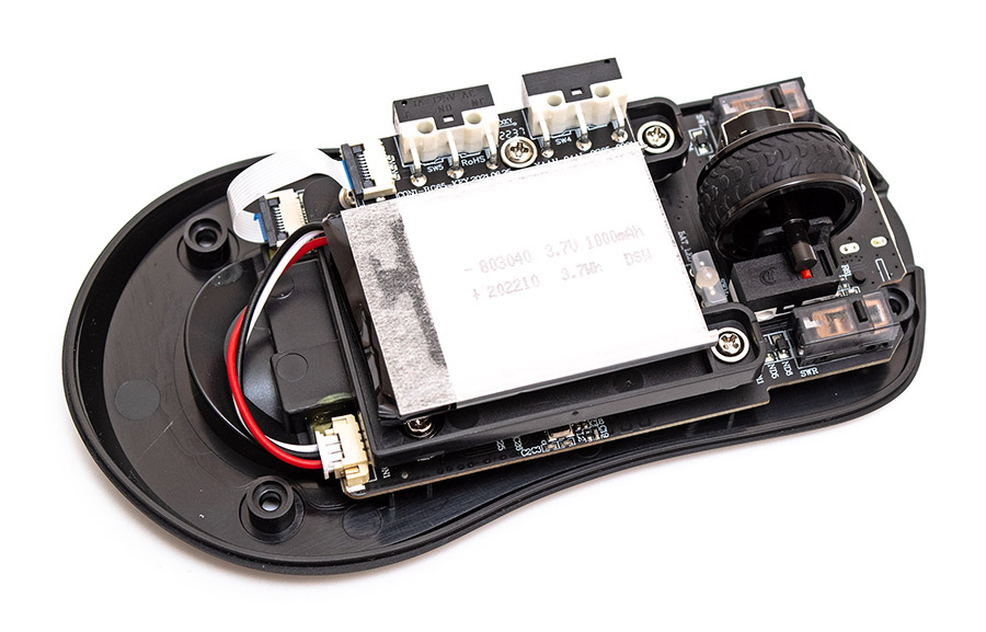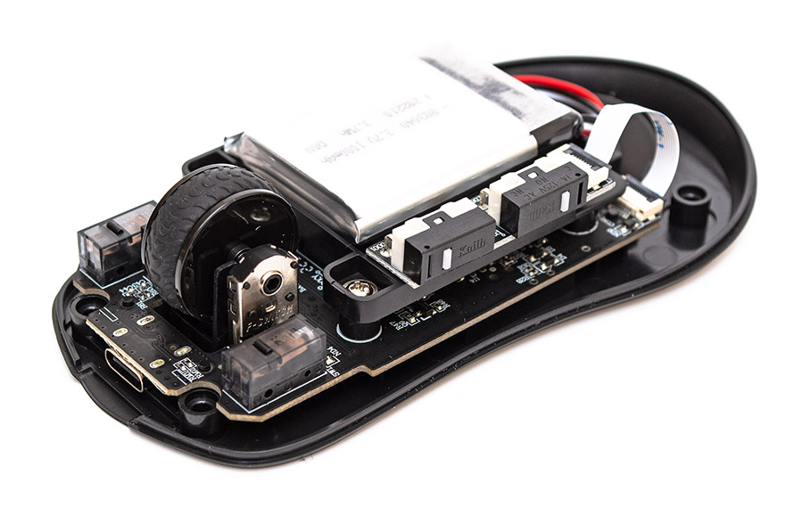 Акумулятор має величезну ємність в 1000 мА·г та напругу в 3,7 В (3,7 Вт·г загалом). Під колесом прокрутки для середньої клавіші миші використано перемикач Changfeng з червоною кнопкою (зазвичай такі мають заявлений ресурс в 5 млн натискань).