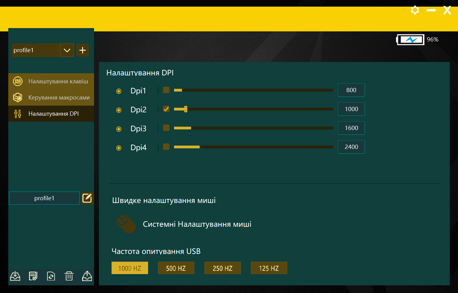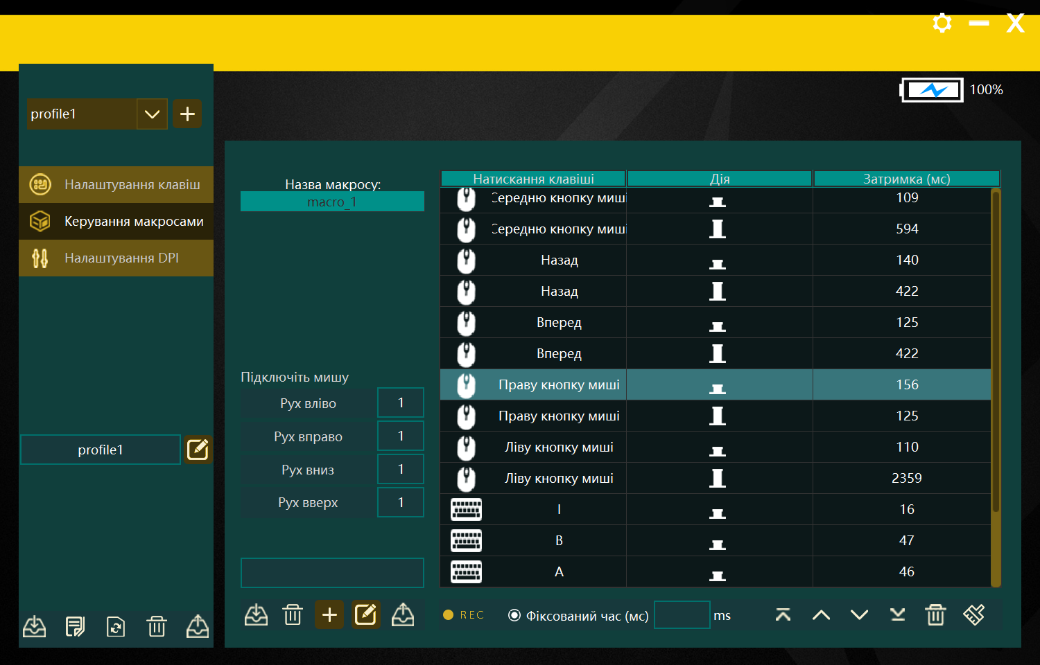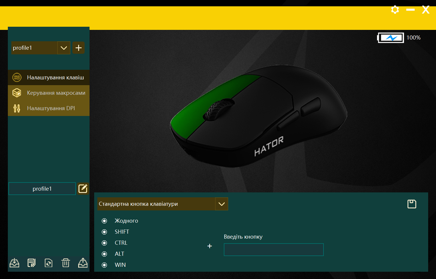 В налаштуваннях кнопок можна змінити команди на п’яти кнопках — ЛКМ, СКМ, ПКМ та двох бокових. При цьому одна клавіша має виконувати функцію ЛКМ. З доступних для призначення команд є функції за замовчуванням, клавіші миші та клавіатури (окрім прокручування), кнопка перемикання cpi, авто-натискач (треба задати затримку в мс та кількість натиснень до 255), мультимедійні команди, команди застосунку офісу, системні команди або макроси. Головне не забути натиснути на іконку збереження змін на мишу у правому нижньому куті. У верхньому лівому кутку є індикатор поточного рівня заряду. Зліва знаходиться головна панель управління профілями та вкладками.