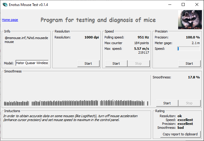 При роботі по Bluetooth Hator Quasar Wireless поводить себе як звичайна офісна миша з частотою опитування в 125 Гц. Зате батарейка живе у неї ще довше, ніж з використанням USB приймача.