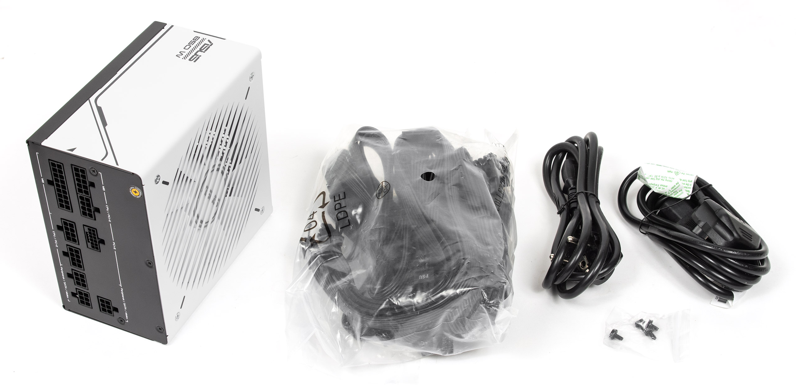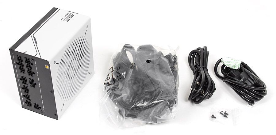 У комплекті з блоком поставляються модульні вихідні кабелі, два мережеві кабелі з різними вилками, пакетик з гвинтами кріплення та інструкція.