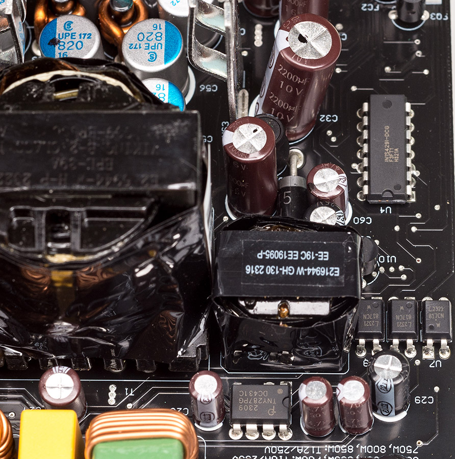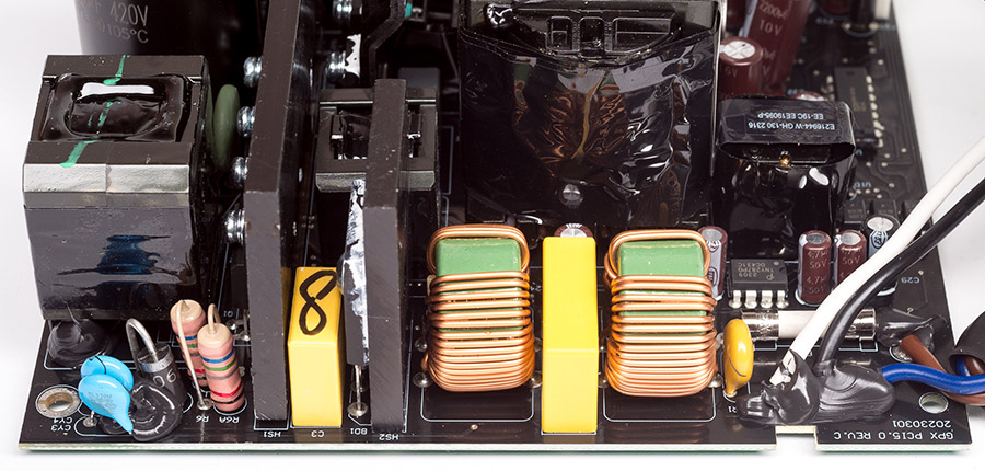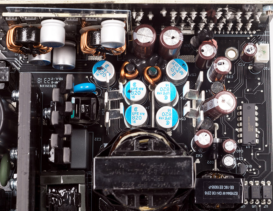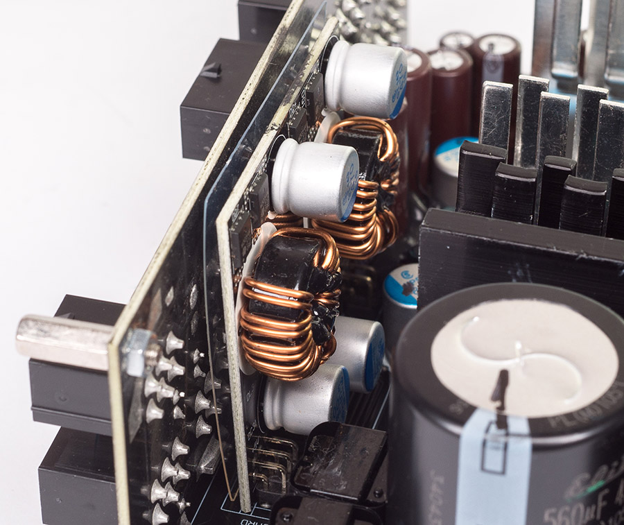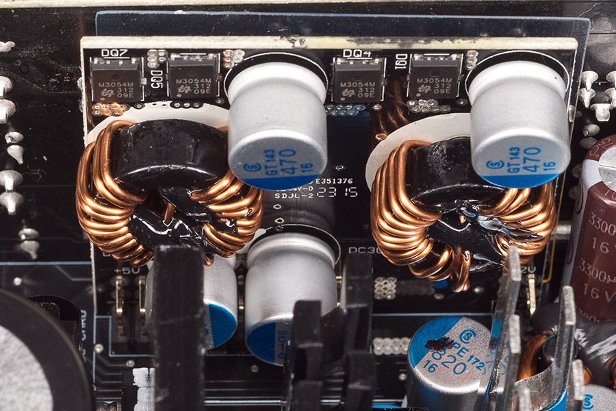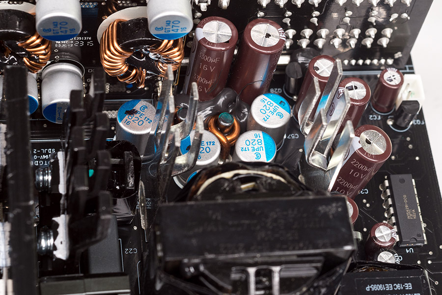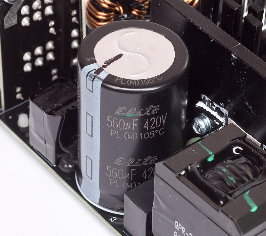 Вихідну напругу фільтрують шість полімерних конденсаторів ємністю 820 мкФ на 16 В і пара електролітичних конденсаторів ємністю 3300 мкФ на 16 В з робочою температурою 105 °C виробництва Elite. Для додаткової фільтрації напруги +12 В на платі з модульними конекторами розпаяно ще десять полімерних конденсаторів ємністю 270 мкФ і напругою 16 В.