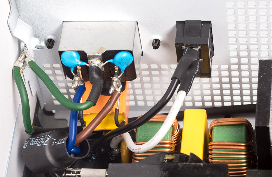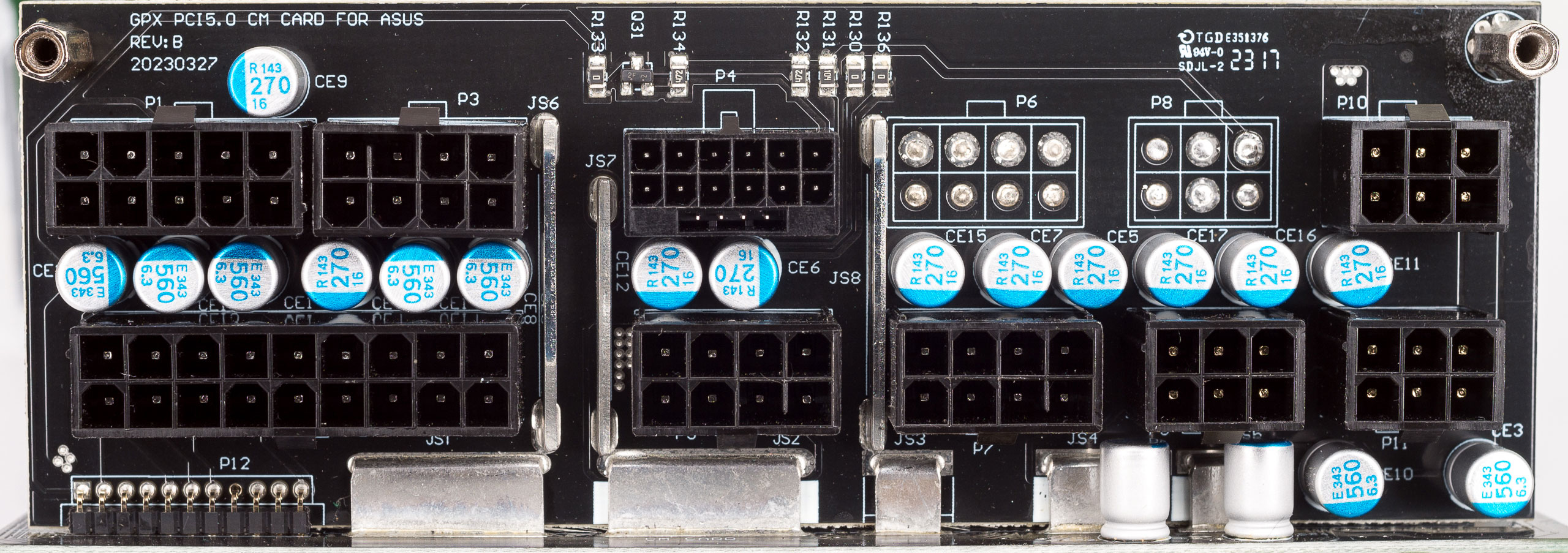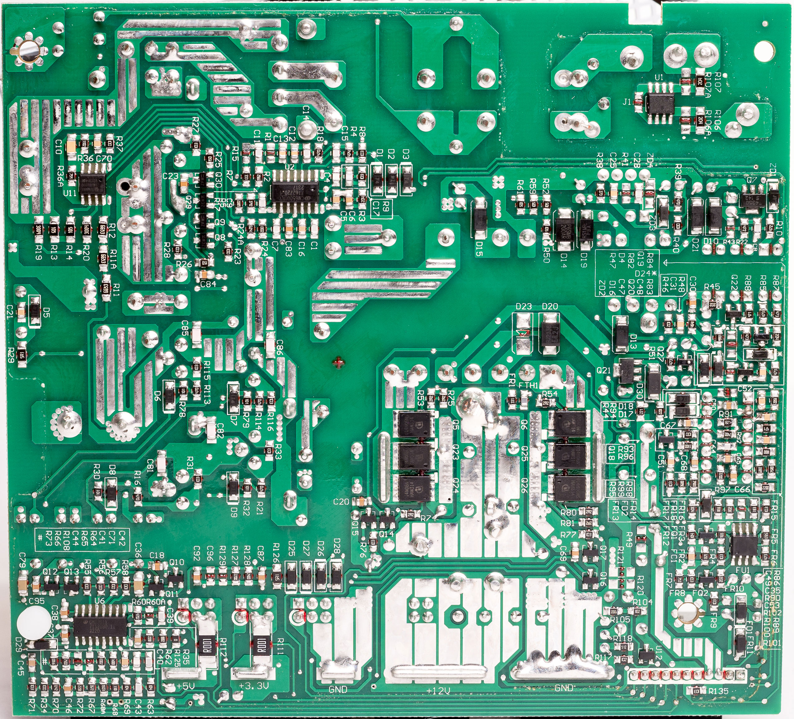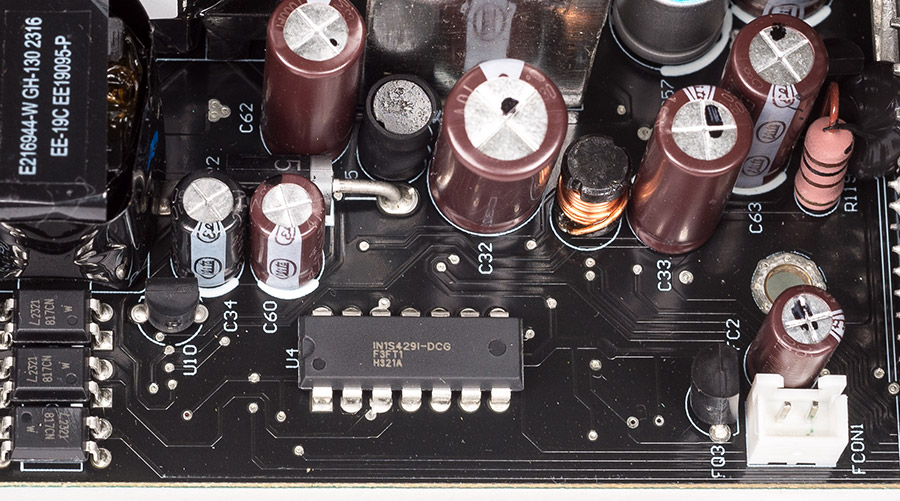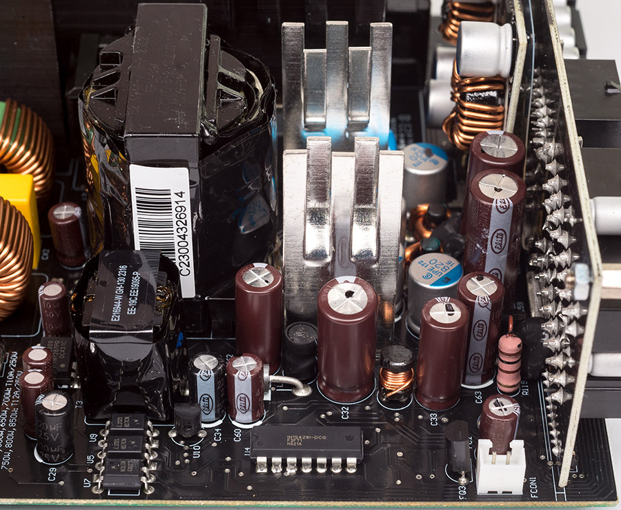 Вихідну напругу фільтрують шість полімерних конденсаторів ємністю 820 мкФ на 16 В і пара електролітичних конденсаторів ємністю 3300 мкФ на 16 В з робочою температурою 105 °C виробництва Elite. Для додаткової фільтрації напруги +12 В на платі з модульними конекторами розпаяно ще десять полімерних конденсаторів ємністю 270 мкФ і напругою 16 В.