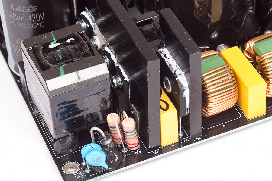 За лінію +12 В відповідає мостовий резонансний LLC-перетворювач із синхронним випрямлячем, керує всім контролер CM6901X. Пара силових транзисторів встановлена на радіатор з компонентами APFC, ще пара на окремому невеликому радіаторі, тип транзисторів розглянути не вдалося.