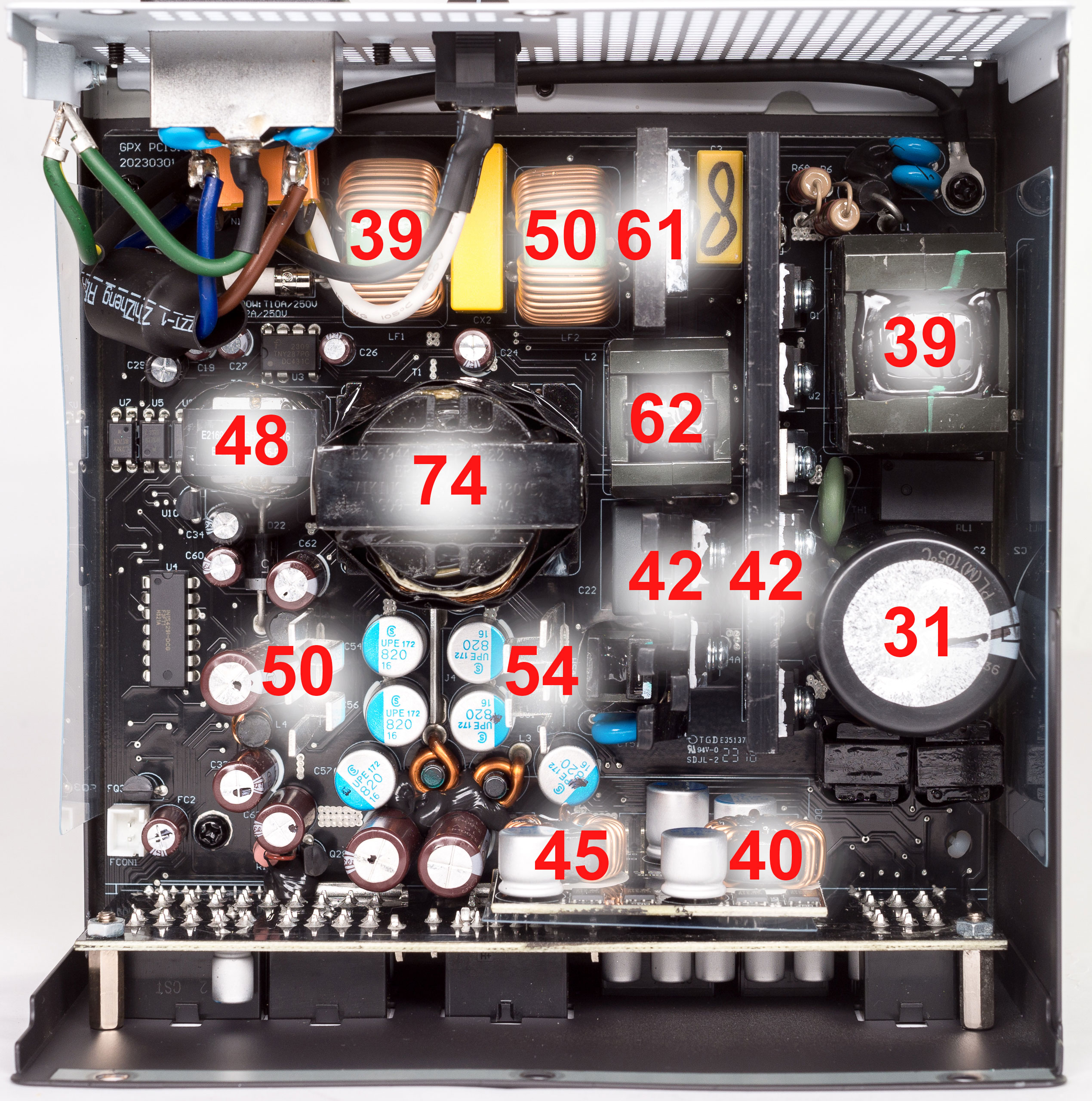 Тест на нагрівання компонентів блоку проводився за температури повітря в приміщенні у 18 °C. Термопара мультиметра Zotek ZT102 була закріплена на одному з силових трансформаторів, блок живлення навантажувався на максимальну потужність, поки температура трансформатора не стабілізувалася, після цього він швидко розбирався і проводилися виміри температур інших компонентів за допомогою пірометра. Результати тесту наведено на наступному фото плати блоку: