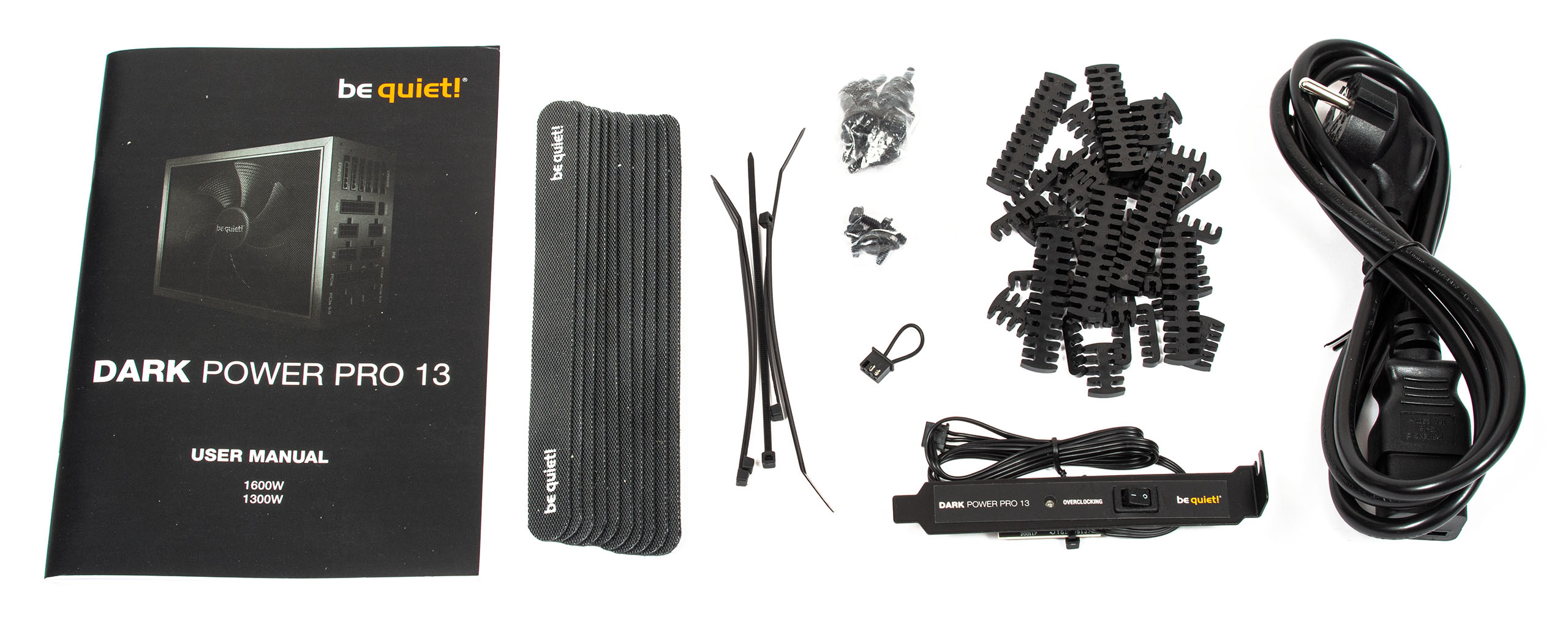 У комплект постачання входить мережевий кабель, модульні дроти, два набори кріплення під викрутку та під ручний затискач, комплект пластикових та тканинних кабельних стяжок, фіксатори для дротів, інструкція, планка Overclocking key з перемикачем та індикатором, перемичка з аналогічною функцією без індикації. Перемикач Overclocking key змінює налаштування системи захисту по лінії +12 В — блок живлення починає витримувати великі імпульсні навантаження без спрацьовування захисту, але на максимальну потужність або обертання вентилятора він не впливає.