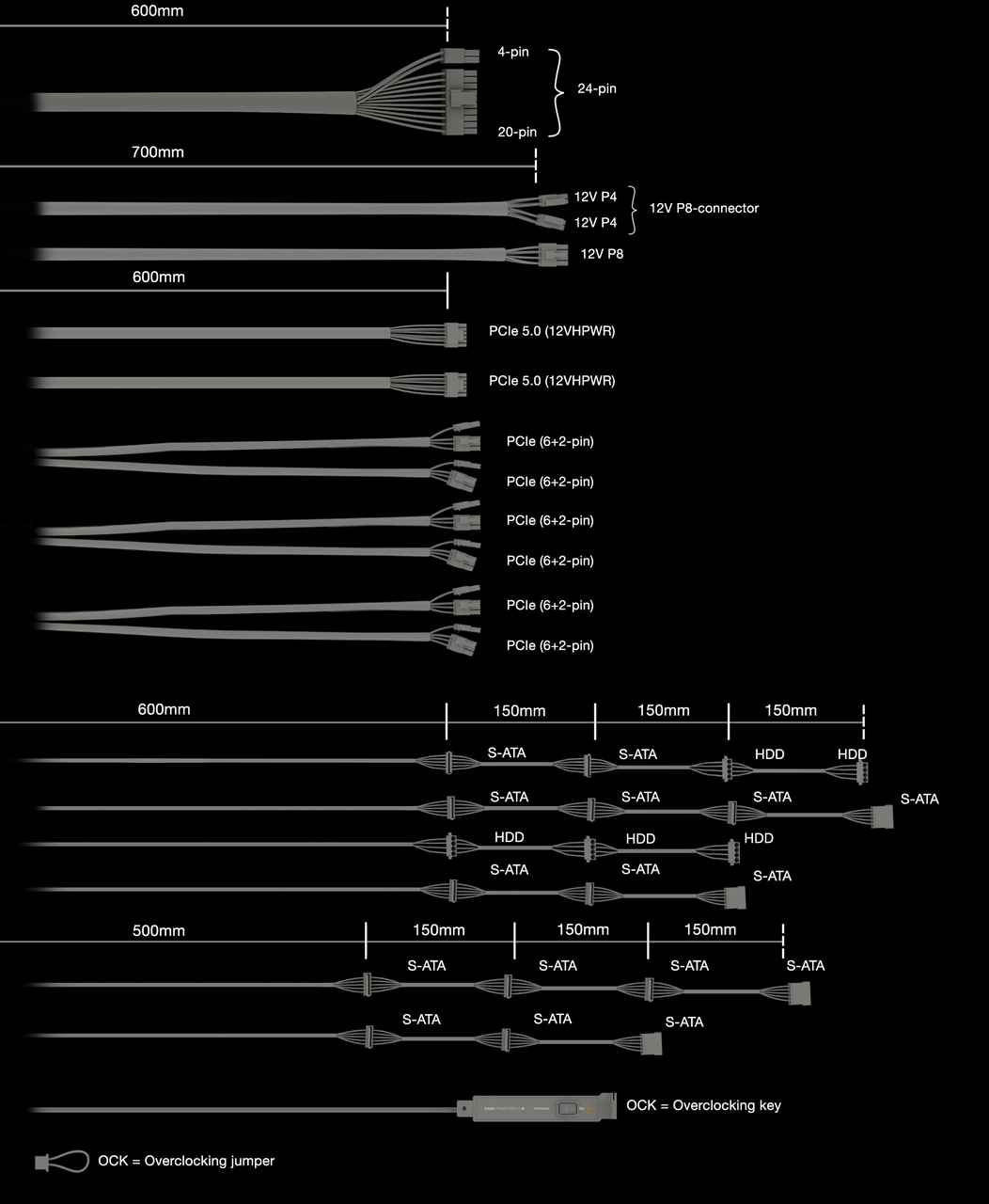 - два 12VHPWR з одним 16-контактним роз'ємом для живлення відеокарти PCI-E 5.0 600 Вт (60 см);