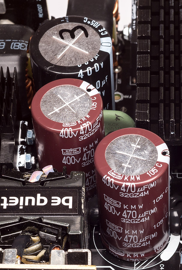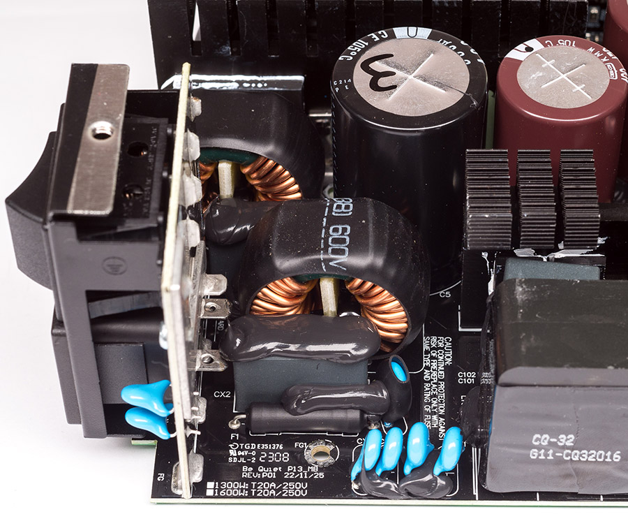 Високовольтний фільтр виконаний на парі електролітичних конденсаторів ємністю 470 мкФ з робочою напругою 400 В і температурою 105 °C виробництва Nippon Chemi Con і одному конденсаторі ємністю 680 мкФ з напругою 400 В і температурою 105 °C виробництва Nichi. Загальна ємність фільтра становить 1620 мкФ. Струм заряду конденсаторів при підключенні до мережі обмежує термістор, який замикає реле при старті блоку для зменшення втрат під час роботи.