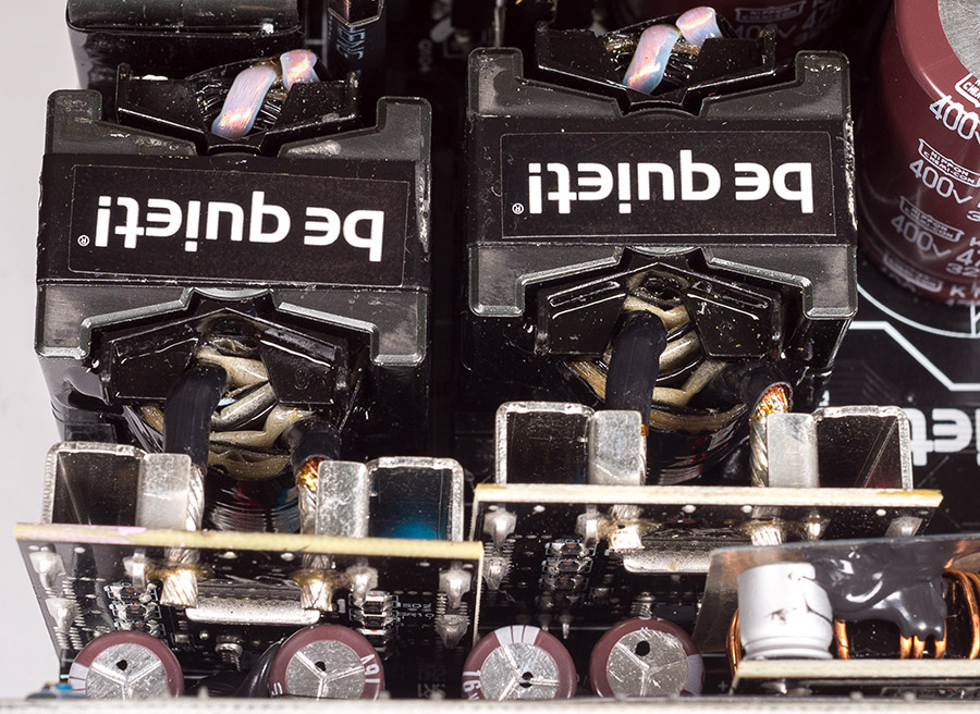 На вході блоку розпаяно повноцінний фільтр імпульсних перешкод другого порядку. Вхідний випрямляч складається з двох діодних збірок LVB 2560 (25 А, 600 В), включених у паралель та встановлених на загальний радіатор із силовими компонентами APFC. Поруч із радіатором розташована пара дроселів коректора, вони не просто включені паралельно, а працюють зі зсувом фаз для зменшення пульсацій. Кожен дросель навантажений на свій силовий транзистор та діод, їх тип розглянути не вдалося.
