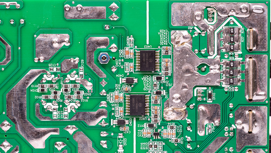 Керує коректором чип UCD3138A — високоінтегрований цифровий контролер живлення, встановлений на окремій невеликій платі. На цій платі поруч є ще один такий самий контролер, що керує силовим перетворювачем по лінії +12 В. Чип UCD3138A може виконувати будь-які функції, пов'язані з перетворенням електричної енергії в блоках живлення, які залежатимуть від прошивки.