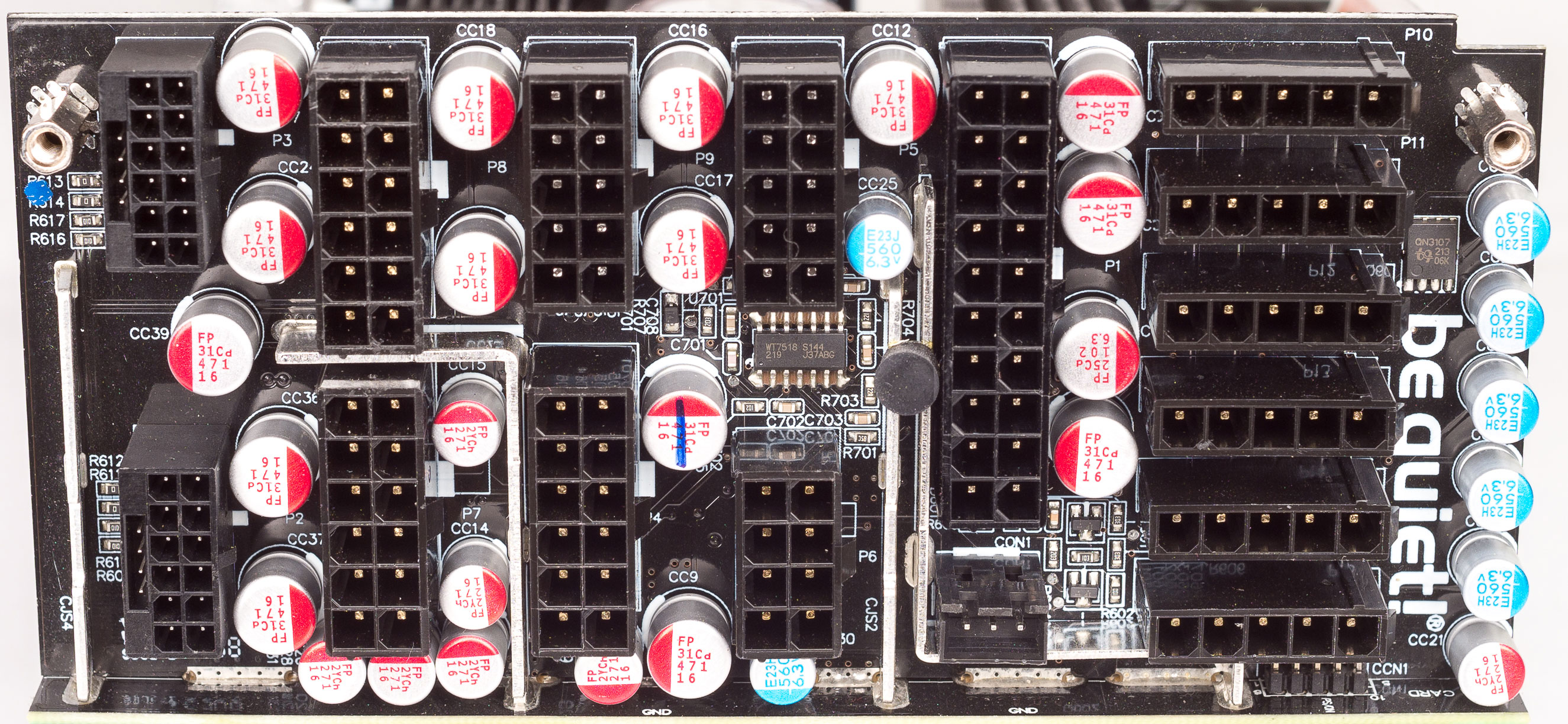 На плату з модульними конекторами напруга +12 В заходить однією шиною і який струм споживає окремий кабель по цих шунтах визначити не вийде. Можливо, на самій платі з роз'ємами є шість додаткових шунтів для організації захисту окремих шести груп роз'ємів, але без розпаювання розглянути монтаж плати не вийде. Керує силовим перетворювачем та синхронними випрямлячами теж контролер UCD3138A. Силові транзистори (їх тип не вдалося розглянути) встановлені на окремому невеликому радіаторі та керуються через два ізольованих драйвери Si8238BD. Вихідна напруга лінії +12 В фільтрують шість полімерних конденсаторів ємністю 470 мкФ на 16 В і чотири електролітичні конденсатори ємністю 3300 мкФ на 16 В з робочою температурою 105 °C виробництва Nippon Chemi Con. Для додаткової фільтрації лінії +12 В на платі підключення модульних кабелів встановлені ще ціла гірлянда полімерних конденсаторів різної ємності з робочою напругою 16 В. З такою батареєю конденсаторів ніяких проблем з пульсаціями бути не повинно.