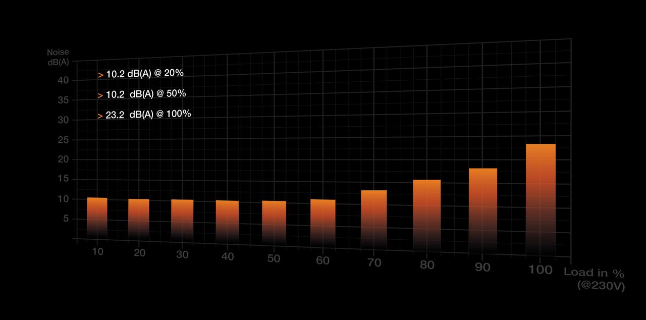 Напівпасивного режиму роботи вентилятора немає, але він працює дуже тихо. При увімкненні блоку він стартує приблизно на 350 оборотах із рівнем шуму 10,2 дБ і до 50% потужності швидкість не збільшується. Зі зростанням навантаження обороти плавно збільшуються приблизно до 800 об/хв, причому він залишається досить тихим навіть на максимальній потужності навантаження.