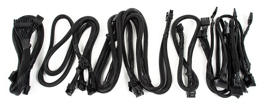Кабелі складаються з проводів із чорною ізоляцією і мають нейлонове обплетення. Довжина кабелів достатня для великих корпусів із нижнім розташуванням блока живлення.