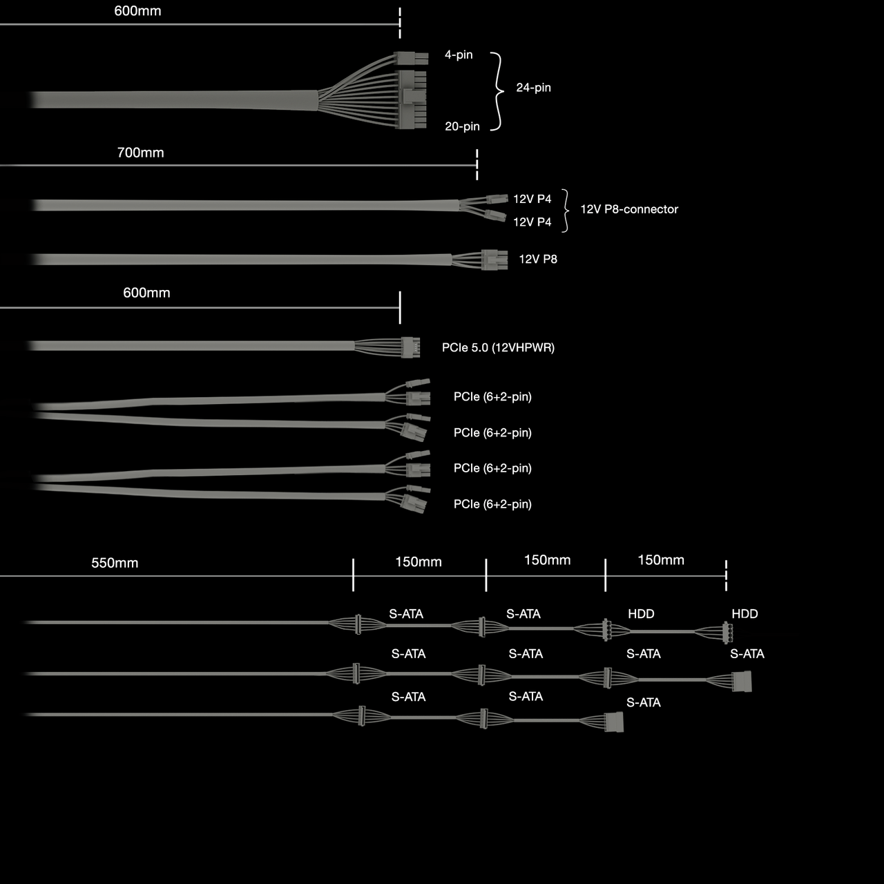- один з одним 16-контактним роз'ємом 12VHPWR для живлення відеокарти PCI-E 5.0 600 Вт (60 см);